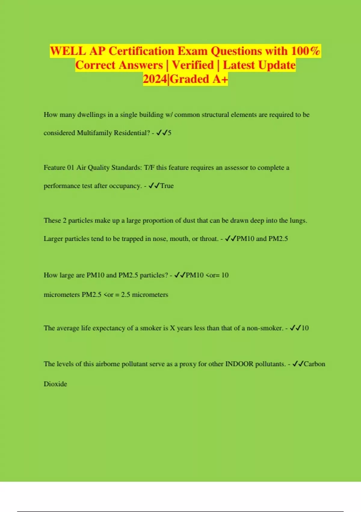 WELL AP Certification Exam Questions with 100% Correct Answers | Verified | Latest Update 2024|Graded A+ How many dwellings in a single building w/ common structural elements are required to be considered Multifamily Residential? - 5 Feature 01 Air Quality Standards: T/F this feature requires an assessor to complete a performance test after occupancy. - True These 2 particles make up a large proportion of dust that can be drawn deep into the lungs. Larger particles tend to be trapped in nose, mouth, or throat. - PM10 and PM2.5 How large are PM10 and PM2.5 particles? - PM10 <or= 10 micrometers PM2.5 <or = 2.5 micrometers The average life expectancy of a smoker is X years less than that of a non-smoker. - 10 The levels of this airborne pollutant serve as a proxy for other INDOOR pollutants. - Carbon Dioxide What documentation is required for Feature 03 Ventilation Effectiveness? - LOA from MEC engineer & Commissioning Report