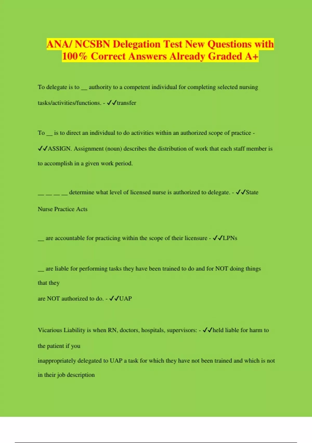 ANA/ NCSBN Delegation Test New Questions with 100% Correct Answers Already Graded A+