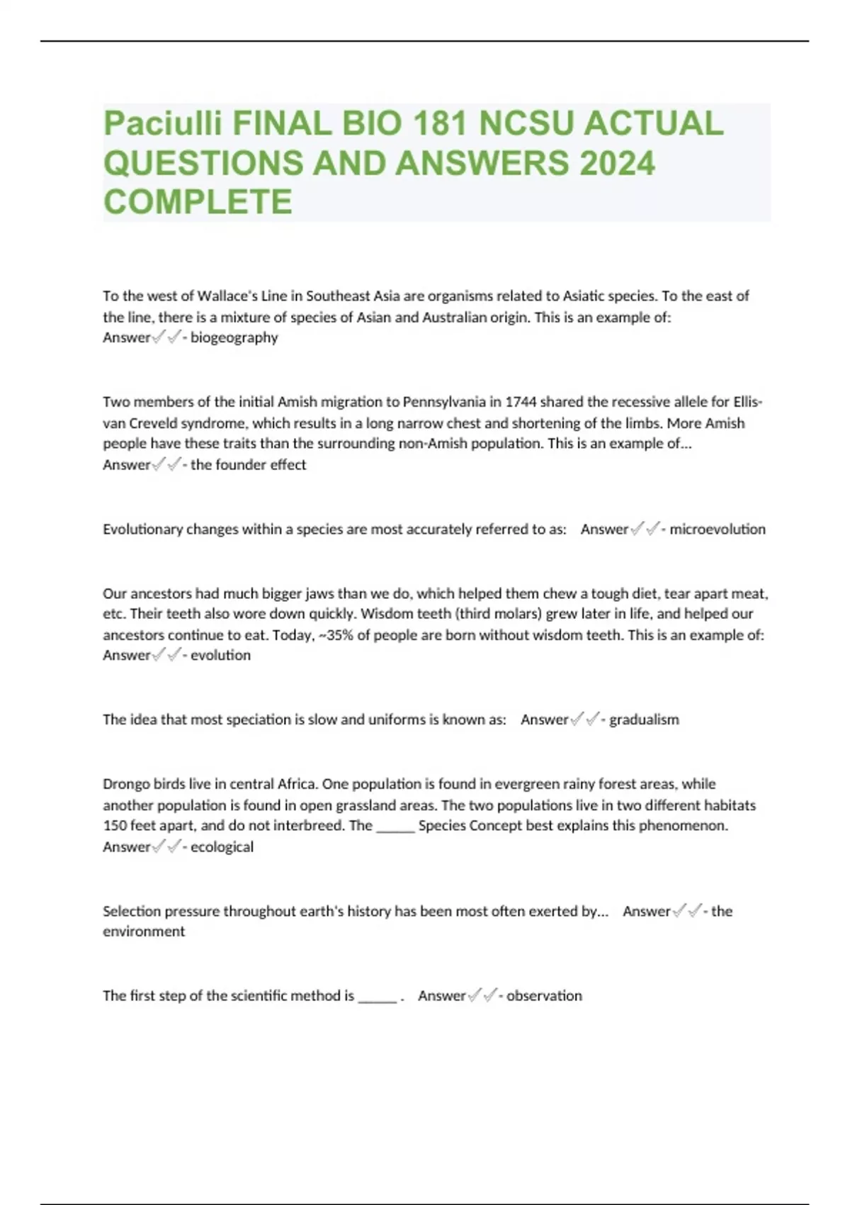 Paciulli FINAL BIO 181 NCSU ACTUAL QUESTIONS AND ANSWERS 2024 COMPLETE