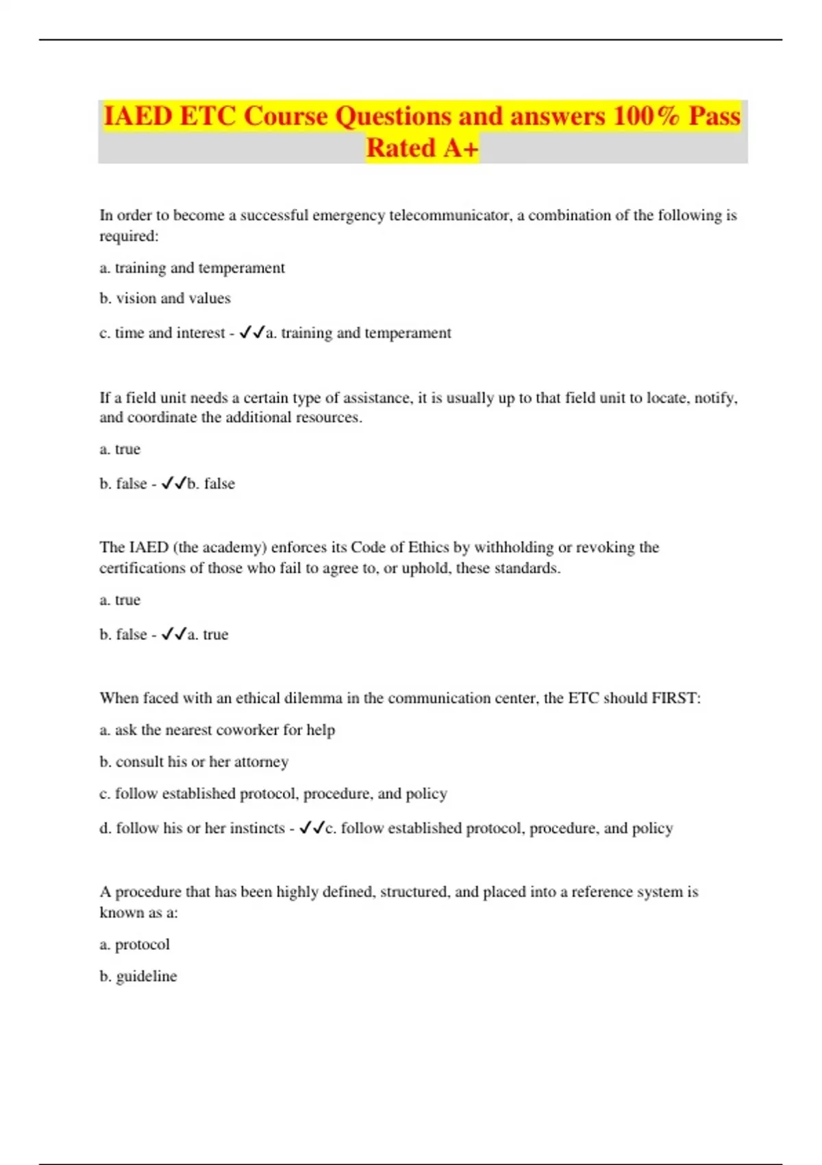 IAED ETC Course Questions and answers 100% Pass Rated A+ In order to become a successful emergency telecommunicator, a combination of the following is required: a. training and temperament b. vision and values c. time and interest - a. training and temperament If a field unit needs a certain type of assistance, it is usually up to that field unit to locate, notify, and coordinate the additional resources. a. true b. false - b. false The IAED (the academy) enforces its Code of Ethics by withholding or revoking the certifications of those who fail to agree to, or uphold, these standards. a. true b. false - a. true When faced with an ethical dilemma in the communication center, the ETC should FIRST: a. ask the nearest coworker for help b. consult his or her attorney c. follow established protocol, procedure, and policy d. follow his or her instincts - c. follow established protocol, procedure, and policy A procedure that has been highly defined, structured, and placed into a reference system is known as a: a. protocol b. guideline