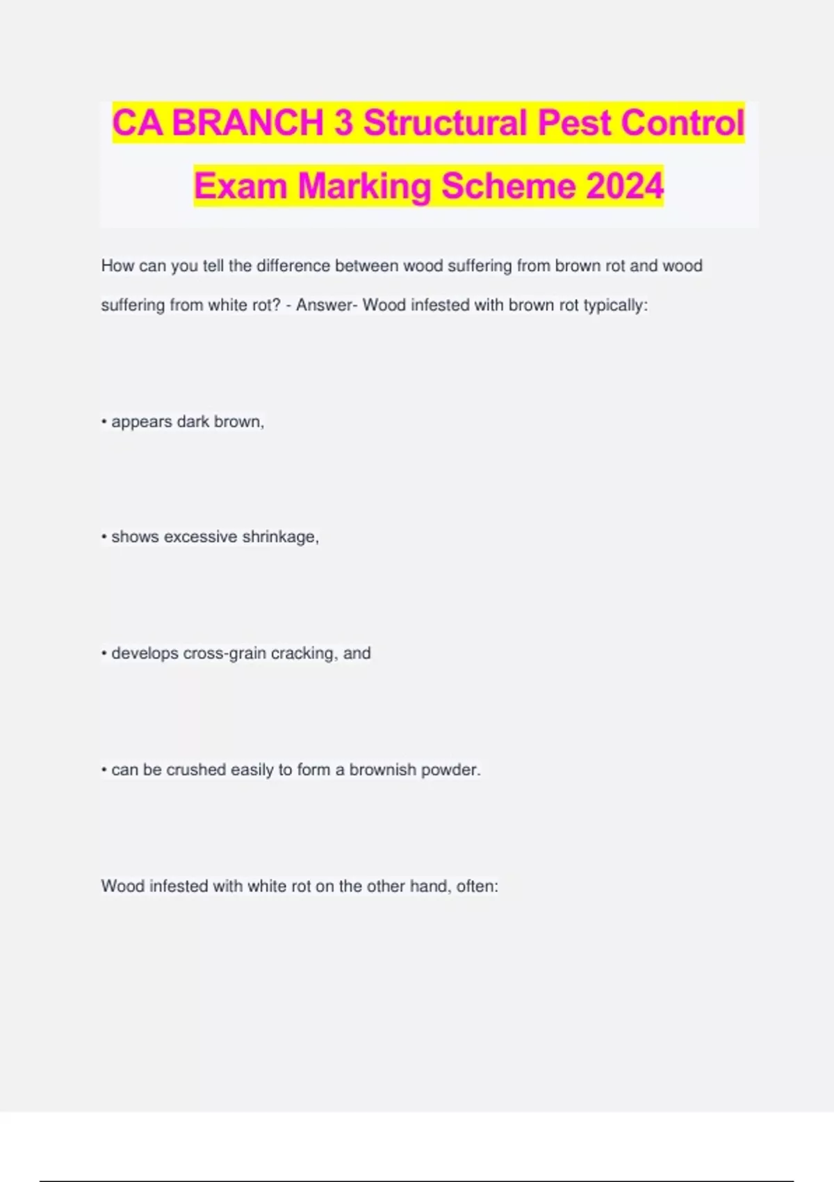 CA BRANCH 3 Structural Pest Control Exam Marking Scheme 2024 How can you tell the difference between wood suffering from brown rot and wood suffering from white rot? - Answer- Wood infested with brown rot typically: • appears dark brown, • shows excessive shrinkage, • develops cross-grain cracking, and • can be crushed easily to form a brownish powder. Wood infested with white rot on the other hand, often: • appears whiter than normal, • shows normal shrinkage, • does not crack across the grain, • is spongy to the touch. What is the difference between the stains caused by stain (sapstain) fungi vs. mold fungi? - Answer- Sapstain fungi live on the starch in wood cells. These fungi may discolor the sapwood entirely or in patches. This stain is deep within the wood and cannot be removed by brushing or planing. On the other hand, discoloration caused by mold fungi is superficial. This means that you can usually remove the discoloration by brushing or planing. However, on hardwoods with open pores (very large and visible vessels) such as the oaks, the surface molds may cause stains that are too deep to remove easily. How can you distinguish between winged termites and winged ants? - Answer- Look at their antennae, waists, and wings. Winged termites have straight antennae, thick waists, and wings that are equal in size and shape. Winged ants have bent antennae, narrow waists, and forewings that are larger than the hind wings. Name the four basic castes of termites. Describe the basic function(s) of each caste. - Answer- Workers - gather food, maintain the galleries, tend the young, and groom the other termites. Soldiers - guard the colony against predators. Primary reproductives - "swarmers" that fly out of their colonies to start new colonies of their own. They are the future kinds and queens of new colonies. Secondary reproductives - supplement egg production in the presence of the king and queen and can take over the egg laying if the queen dies or begins to fail. Do subterranean termites live entirely within wood? Why or why not? - Answer- No, because they require a constant source of moisture to survive. However, they can live in wood with less than 20% moisture by getting their moisture from the ground. They transport this moisture through flattened, earthen shelter tubes that serve as passageways from the soil to the infested wood. How do subterranean termites most often infest wood in buildings? - Answer- They gain entry through untreated wood that touches or is close to the ground, particularly at porches, steps, and terraces. They can also infest buildings through cracks or voids in foundations or concrete floors that make it easy for termites to reach wood that is not close to the soil. Describe the frass pellets of drywood termites. - Answer- They are small and cylindrical with six depressions on the sides. These pellets are unique to drywood termites and are used for identification. Where do drywood termites most often occur? - Answer- In southern Florida, southern California, and along the southern gulf coast of the United States. Do drywood termites live entirely within wood? Why or why not? - Answer- Yes, because they require little moisture (wood MCs as low as 5%). Unlike subterranean termites, drywood termites have no connection with the soil. List several ways you can protect wood from termites. - Answer- To protect wood from subterranean termites, you can: • apply insecticides to the soil around buildings, and • avoid using wood mulches next to buildings. To protect wood from subterranean and drywood termites, you can: • use physical barriers on foundations, and