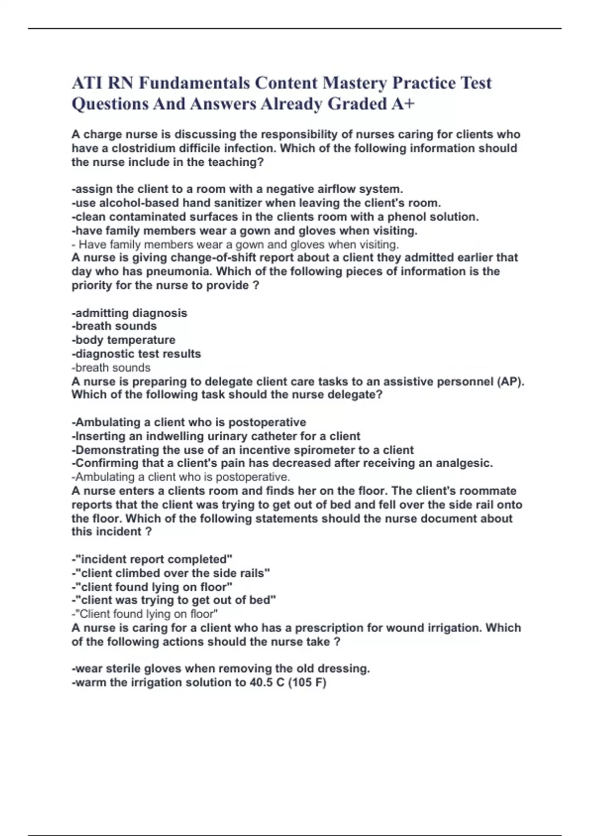 ATI RN Fundamentals Content Mastery Practice Test Questions And Answers Already Graded A+ A charge nurse is discussing the responsibility of nurses caring for clients who have a clostridium difficile infection. Which of the following information should the nurse include in the teaching? -assign the client to a room with a negative airflow system. -use alcohol-based hand sanitizer when leaving the client's room. -clean contaminated surfaces in the clients room with a phenol solution. -have family members wear a gown and gloves when visiting. - Have family members wear a gown and gloves when visiting. A nurse is giving change-of-shift report about a client they admitted earlier that day who has pneumonia. Which of the following pieces of information is the priority for the nurse to provide ? -admitting diagnosis -breath sounds -body temperature -diagnostic test results -breath sounds A nurse is preparing to delegate client care tasks to an assistive personnel (AP). Which of the following task should the nurse delegate? -Ambulating a client who is postoperative -Inserting an indwelling urinary catheter for a client -Demonstrating the use of an incentive spirometer to a client -Confirming that a client's pain has decreased after receiving an analgesic. -Ambulating a client who is postoperative. A nurse enters a clients room and finds her on the floor. The client's roommate reports that the client was trying to get out of bed and fell over the side rail onto the floor. Which of the following statements should the nurse document about this incident ? -"incident report completed" -"client climbed over the side rails" -"client found lying on floor" -"client was trying to get out of bed" -"Client found lying on floor" A nurse is caring for a client who has a prescription for wound irrigation. Which of the following actions should the nurse take ? -wear sterile gloves when removing the old dressing. -warm the irrigation solution to 40.5 C (105 F) -cleanse the wound from the center outward. -use a 20-ml syringe to irrigate the wound. -cleanse the wound from the center outward. A nurse is admitting a client who has rubella. Which of the following types of transmission-based precautions should the nurse initiate? -droplet -airborne -contact -protective environment -droplet A nurse is providing discharge teaching for a client who has a new prescription for a home oxygen concentrator. Which of the following instructions should the nurse provide to the client and his family? (Select all that apply). -check the cord routinely for frays or tearing -keep the unit at least 1.2m (4 feet) away from a gas stove. -consider purchasing a generator for a power backup. -observe for signs of hypoxia -select synthetic clothing and bedding. -check cord routinely for frays or tearing. -consider purchasing a generator for power backup -observe for signs of hypoxia A nurse is calculating a client's fluid intake over the past 8hr. Which of the following items should the nurse plan to document on the clients intake and output record as 120-ml of fluid? -2 cups of soup -1 quart of water -8 oz of ice chips -6 oz of tea -8 oz of ice chips A nurse is caring for a client who has tuberculosis. Which of the following actions should the nurse take? ( select all that apply) -place the client room with a negative-pressure airflow -wear gloves when assisting a client with oral care. -limit each visitor to 2-hr increments. -wear a surgical mask when providing client care. -use antimicrobial sanitizer for hand hygiene -place the client in a room with negative-pressure airflow -wear gloves when assisting the client with oral care -use antimicrobial sanitizer for hand hygiene A nurse is caring for a client who is refusing a blood transfusion for religious reasons. The client's partner wants the client to have the blood transfusion. Which of the following actions should the nurse take? -ask the client to consider a direct donation -withhold the blood transfusion -request a consultation with the ethics committee -ask the clients family to intervene -withhold the blood transfusion A nurse is teaching a client whose left leg is in a cast about using crutches. Which of the following statements should the nurse identify as an indication that the client understands the teaching? -"when descending stairs, I will first shift my weight to my right leg." -"I should place my crutches 12 inches in-front and to the side of each food" -"as I sit down, I will hold one crutch in each hand." -"I will make sure the shoulder rest are snug against my armpits." -"when descending stairs, I will first shift my weight to my right leg" A nurse has accepted a verbal prescription "for three tenths of a milligram of levothyroxine IV stat" for a client who has myxedema coma. How should the nurse transcribe the dosage of this medication in the clients medical record? - .3 mg - 0.3 mg - 0.30 mg - 3/10 mg "0.3 mg" A nurse is caring for a client who has an indwelling urinary catheter. Which of the following findings indicates that the catheter requires irrigation? -Urine has an unusual order. -Urine specific gravity is 1.035. -Bladder scan shows 525 ml of urine -Urine is positive for ketones. -Bladder scan shows 525 ml of urine A nurse is assessing an adult client who has been immobile for the past 3 weeks. For which of the following finding should the nurse intervene? - Erythema on pressure points - lower extremity pulse strength 2+ - fluid intake of 3000 ml per day. - one bowel movement ever other days -Erythema on pressure points A nurse is caring for a client who has an NG tube and is receiving intermittent feedings through an open system. Which of the following actions should the nurse take first? -Rinse the feeding bad with water between feedings - tell the client to keep the head of the bed elevated at least 30* -make sure the enteral feeding formula is at room temperature - wipe the top of the formula with alcohol. - tell the client to keep the head of the bed el