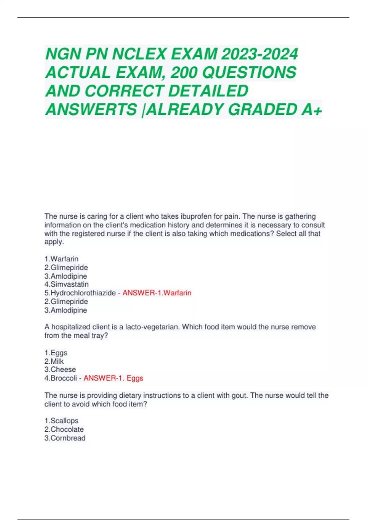 NGN PN NCLEX EXAM ACTUAL EXAM, 200 QUESTIONS AND CORRECT DETAILED ANSWERTS |ALREADY GRADED A+ The nurse is caring for a client who takes ibuprofen for pain. The nurse is gathering information on the client's medication history and determines it is necessary to consult with the registered nurse if the client is also taking which medications? Select all that apply. 1.Warfarin 2.Glimepiride 3.Amlodipine 4.Simvastatin 5.Hydrochlorothiazide - ANSWER-1.Warfarin 2.Glimepiride 3.Amlodipine A hospitalized client is a lacto-vegetarian. Which food item would the nurse remove from the meal tray? 1.Eggs 2.Milk 3.Cheese 4.Broccoli - ANSWER-1. Eggs The nurse is providing dietary instructions to a client with gout. The nurse would tell the client to avoid which food item? 1.Scallops 2.Chocolate 3.Cornbread 4.Macaroni products - ANSWER-1. Scallops The nurse reinforces instructions to a client to increase the amount of riboflavin in the diet. The nurse would tell the client to select which food item that is high in riboflavin? 1.Milk 2.Tomatoes 3.Citrus fruits 4.Green, leafy vegetables - ANSWER-1.Milk The medication prescribed is hydromorphone hydrochloride 3 mg intramuscularly, every 4 hours as needed. The medication label reads hydromorphone hydrochloride 4 mg/1 mL. The nurse would prepare to administer how many mL to the client? Fill in the blank. - ANSWER-0.75 mL The medication prescribed is digoxin 0.25 mg orally, daily. The medication label reads digoxin 0.125 mg/tablet. The nurse would prepare how many tablet(s) to administer the dose? Fill in the blank. - ANSWER-2 tablets The medication prescribed is heparin 5000 units subcutaneously, every 12 hours. The medication vial reads heparin 10,000 units/mL. The nurse prepares how many milliliters to administer one dose? Fill in the blank. - ANSWER-0.5 mL The medication prescribed is metoclopramide hydrochloride 10 mg intramuscularly times one dose. The medication label reads metoclopramide hydrochloride 5 mg/mL. The nurse prepares how much medication to administer the dose? Fill in the blank. - ANSWER-2 mL The medication prescribed is morphine sulfate 6 mg subcutaneously. The medication label states morphine sulfate 10 mg/1 mL. The nurse plans to prepare how much medication to administer the dose? Fill in the blank. - ANSWER-0.6 mL The medication prescribed is prochlorperazine 5 mg intramuscularly, every 4 hours as needed. The medication label states prochlorperazine 10 mg/mL. The nurse prepares how much medication to administer the dose? Fill in the blank. - ANSWER-0.5 mL The medication prescribed is haloperidol, 4 mg intramuscularly, immediately. The medication label states 5 mg/1 mL. The nurse prepares how much medication to administer the dose? Fill in the blank and round the answer to one decimal place. - ANSWER-0.8 mL The medication prescribed is levodopa 1 g orally, daily. The medication label states levodopa, 500-mg tablets. The nurse prepares to administer how many tablets at the evening dose? Fill in the blank. - ANSWER-2 tablets The medication prescribed is zidovudine, 0.2 g orally, three times daily. The medication label states zidovudine, 100-mg tablets. The nurse prepares to administer how many tablets for one dose? Fill in the blank. - ANSWER-2 tablets The medication prescribed is methylprednisolone acetate 60 mg intramuscularly. The medication label states methylprednisolone acetate 40 mg/1 mL. How many milliliters will the nurse prepare to administer to the client? Fill in the blank. - ANSWER-1.5 mL The medication prescription states to administer acetaminophen 650 mg orally for a temperature of more than 38° C. The medication bottle states acetaminophen, 325 mg tablets. The nurse takes the client's temperature and notes that it is 101° F. The nurse plans to take which action? 1.Administer two tablets. 2.Administer three tablets. 3.Do not administer at this time. 4.Check the client's temperature in 30 minutes. - ANSWER-1. Administer two tablets. The medication prescription reads phenytoin 0.2 g orally, twice daily. The medication label states 100-mg capsules. The nurse prepares how many capsule(s) to administer one dose? Fill in the blank. - ANSWER-2 capsules The intravenous prescription is 1000 mL of 0.9% NaCl (normal saline) to run over 12 hours. The drop factor is 15 gtts/1 mL. The nurse plans to adjust the flow rate to how many gtts/minute? Fill in the blank and record the answer to the nearest whole number. - ANSWER-21 gtts/min The medication is an intramuscular dose of 400,000 units of penicillin G benzathine. The medication label reads penicillin G benzathine 300,000 units/mL. The nurse prepares how much medication to administer the correct dose? Fill in the blank and record the answer using one decimal place. - ANSWER-1.3 mL The intravenous prescription is 3000 mL of 5% dextrose in water (D5W) to run over a 24-hour period. The drop factor is 10 gtts/1 mL. The nurse plans to adjust the flow rate to how many gtts/minute? Fill in the blank and record the answer to the nearest whole number. - ANSWER-21 gtts/min The nurse is preparing to administer an intermittent tube feeding to a client. The nurse aspirates 90 mL of residual from the tube. What would the nurse do? Select all that apply. 1.Hold the feeding. 2.Document the amount of residual. 3.Place it into a container for laboratory analysis. 4.Reinstill the residual and administer the feeding. 5.Deduct the amount of the residual from the new feeding before administering. - ANSWER-2.Document the amount of residual. 4.Reinstill the residual and administer the feeding. The nurse is inserting an indwelling urinary catheter into a male client. As the catheter is inserted into the urethra, urine begins to flow into the tubing. When would the nurse inflate the balloon? 1.Immediately inflate the balloon. 2.Insert the catheter 2.5 cm to 5 cm and inflate the balloon. 3.Advance the catheter to the bifurcation and inflate the balloon. 4.Insert the catheter until resistance is met and inflate