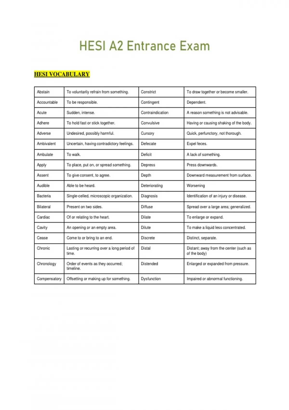 Hesi a2 Entrance Exam Latest Update 1. The lower surface of a structure is referred to as... INFERIOR 2. Injurious? TOXIC 3. Equilibrium? SENSE OF BALANCE 4. Site? LOCATION 5. The patient gave his Assent? AGREEMENT 6.The technician wore gloves as precaution? PREVENTIVE MEASURE 7. The of his right eye was damaged. LENS ( correct word usage) 8. The inebriated man staggered while walking to his car. STUMBLE 9. The nurse noticed an ominous sign? Dangerous