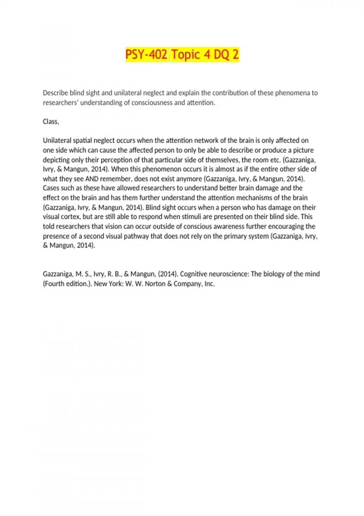 PSY-402 Topic 4 DQ 2 Describe blind sight and unilateral neglect and explain the contribution of these phenomena to researchers’ understanding of consciousness and attention. Class, Unilateral spatial neglect occurs when the attention network of the brain is only affected on one side which can cause the affected person to only be able to describe or produce a picture depicting only their perception of that particular side of themselves, the room etc. (Gazzaniga, Ivry, & Mangun, 2014). When this phenomenon occurs it is almost as if the entire other side of what they see AND remember, does not exist anymore (Gazzaniga, Ivry, & Mangun, 2014). Cases such as these have allowed researchers to understand better brain damage and the effect on the brain and has them further understand the attention mechanisms of the brain (Gazzaniga, Ivry, & Mangun, 2014). Blind sight occurs when a person who has damage on their visual cortex, but are still able to respond when stimuli are presented on their blind side. This told researchers that vision can occur outside of conscious awareness further encouraging the presence of a second visual pathway that does not rely on the primary system (Gazzaniga, Ivry, & Mangun, 2014). Gazzaniga, M. S., Ivry, R. B., & Mangun, (2014). Cognitive neuroscience: The biology of the mind (Fourth edition.). New York: W. W. Norton & Company, Inc.