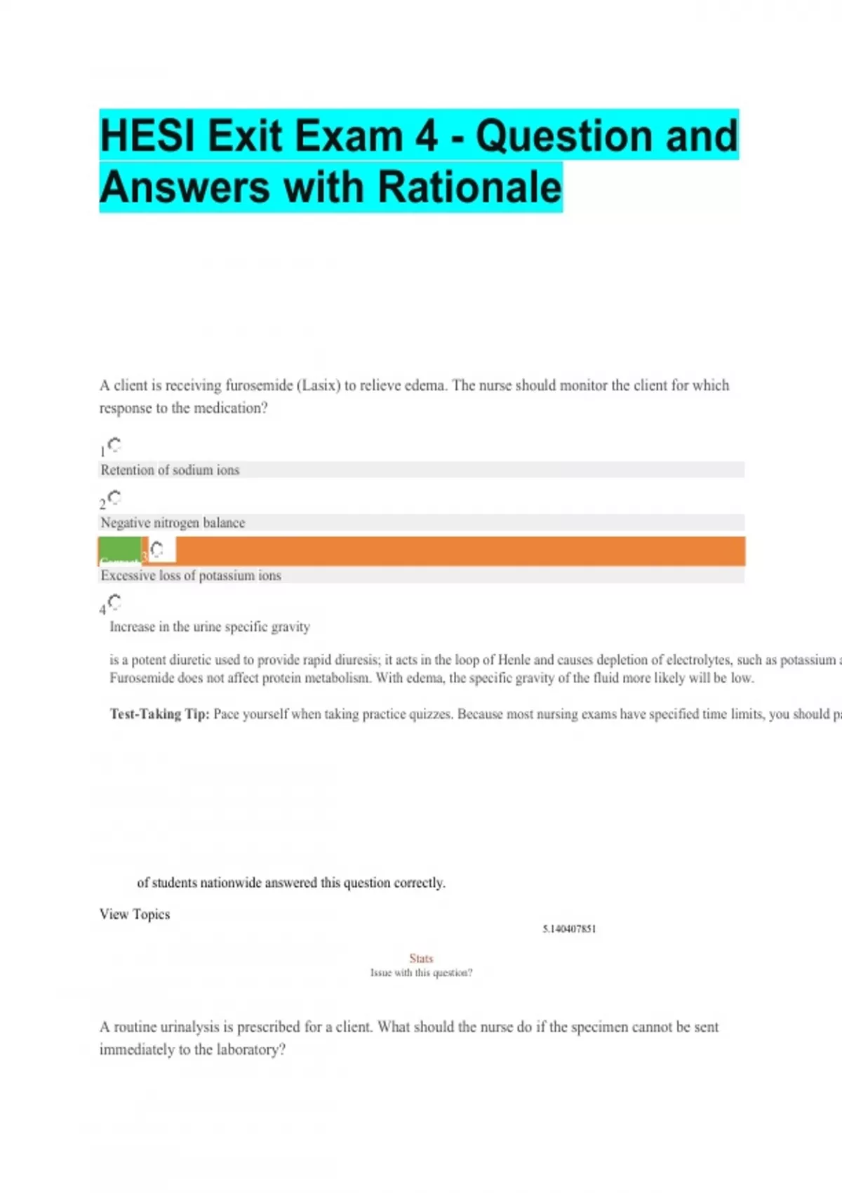 HESI Exit Exam 4 - Question and Answers with Rationale A client is receiving furosemide (Lasix) to relieve edema. The nurse should monitor the client for which response to the medication? 1 Retention of sodium ions 2 Negative nitrogen balance Excessive loss of potassium ions 4 View Topics Stats Issue with this question? A routine urinalysis is prescribed for a client. What should the nurse do if the specimen cannot be sent immediately to the laboratory? 1 3 4 View Topics Stats Issue with this question? A nurse is notified that the latest potassium level for a client in acute renal failure is 6.2 mEq. What action should the nurse take? 1 Alert the cardiac arrest team 2 Call the laboratory to repeat the test Take vital signs and notify the primary health care provider 4 Obtain an ECG strip and obtain an antiarrhythmic medication View Topics Stats Issue with this question? A client with a diagnosis of uncontrolled diabetes began receiving Lasix (Furosemide) two days ago. The nurse reviews the morning lab results and discovers that the client's potassium level is 2.8 mEq/L. What is the most appropriate action for the nurse to take? 1 2 4 View Topics Stats Issue with this question? Which is the most serious complication for which the nurse must monitor a client with kidney failure? 1 Anemia 2 Weight loss Hyperkalemia 4 Platelet dysfunction View Topics Stats Issue with this question? An obese client who is mildly hypertensive is hospitalized with a diagnosis of ureteral colic and hematuria. What is the immediate focus of nursing care for this client? 2 Weight 3 Hematuria 4 Hypertension View Topics 1. A client in a nursing home is diagnosed with urethritis. What should the nurse plan to do before initiating antibiotic therapy prescribed by the health care provider? 1 Prepare for urinary catheterization. Teach the client how to perform perineal care.