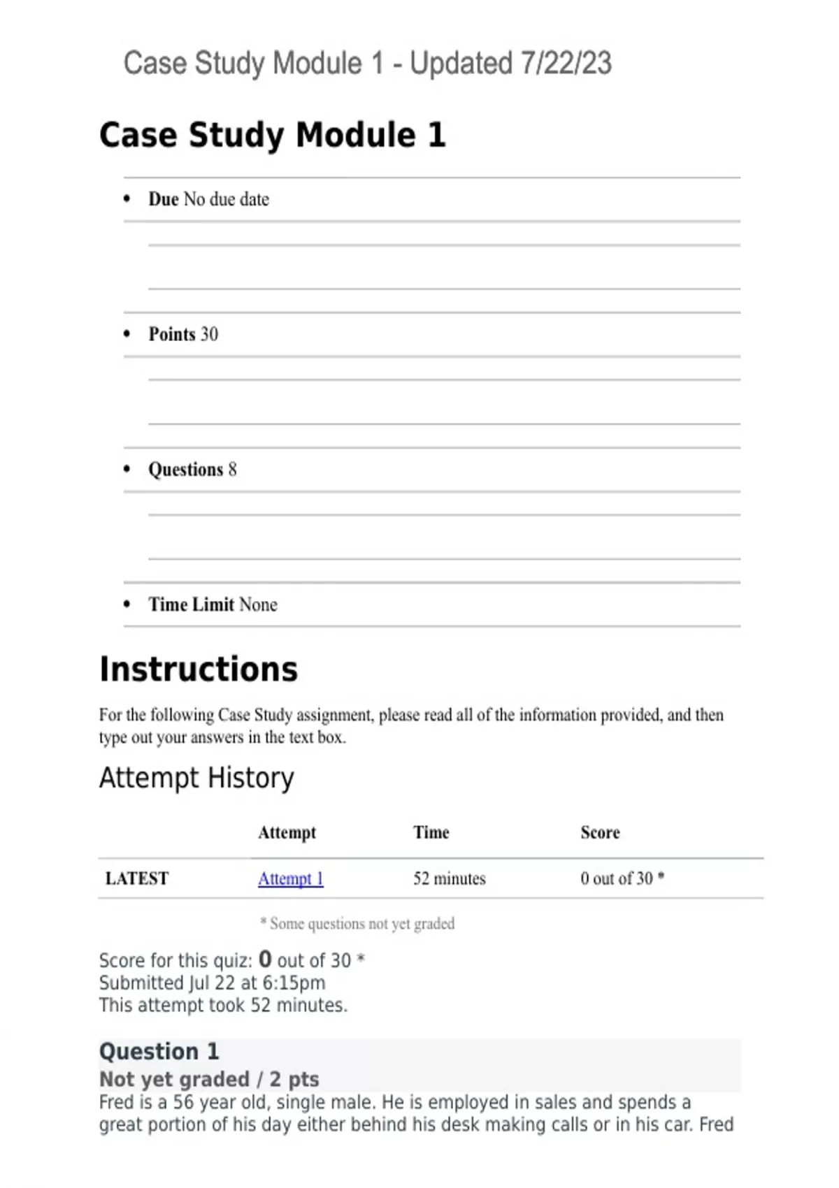 Due No due date Points 30 Questions 8 Time Limit None Instructions For the following Case Study assignment, please read all of the information provided, and then type out your answers in the text box. Attempt History Attempt Time Score LATEST Attempt 1 52 minutes 0 out of 30 * * Some questions not yet graded Score for this quiz: 0 out of 30 * Submitted Jul 22 at 6:15pm This attempt took 52 minutes. Question 1 Not yet graded / 2 pts Fred is a 56 year old, single male. He is employed in sales and spends a great portion of his day either behind his desk making calls or in his car. Fred