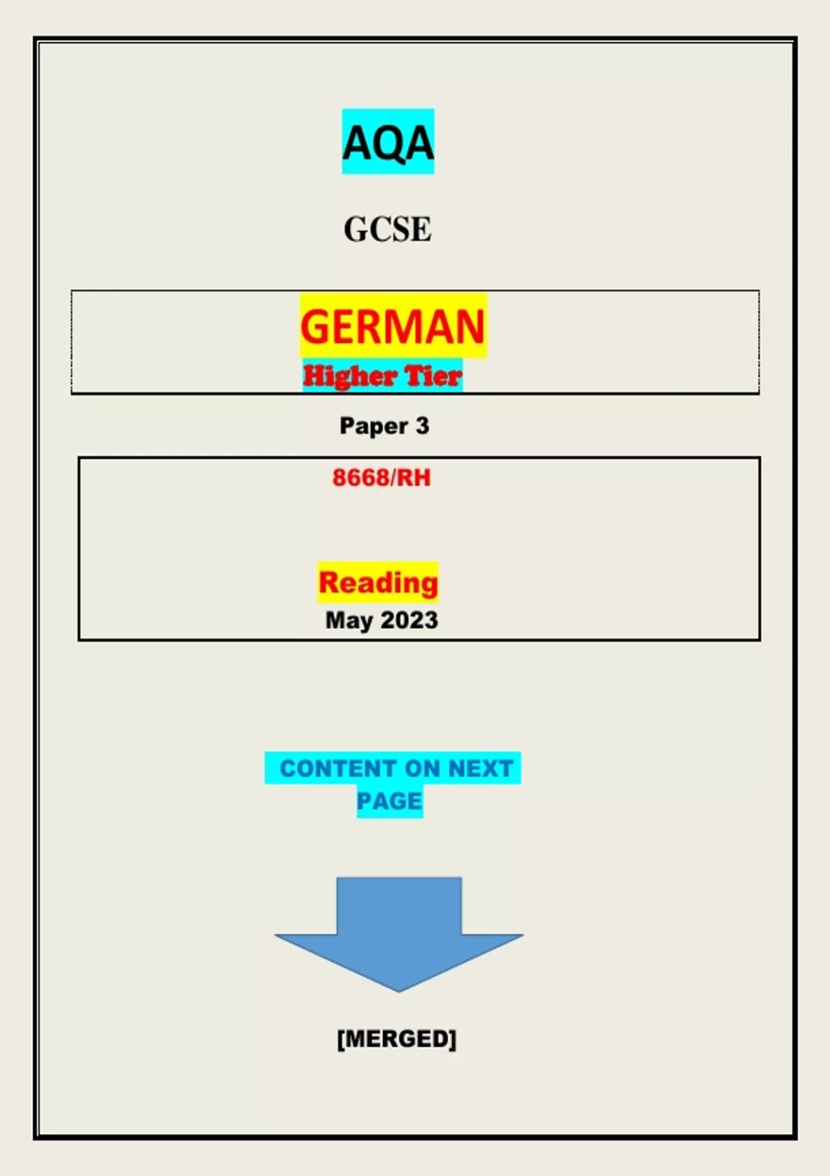 AQA GCSE GERMAN Higher Tier Paper 3 8668/RH Reading||MERGED||GRADED A+
