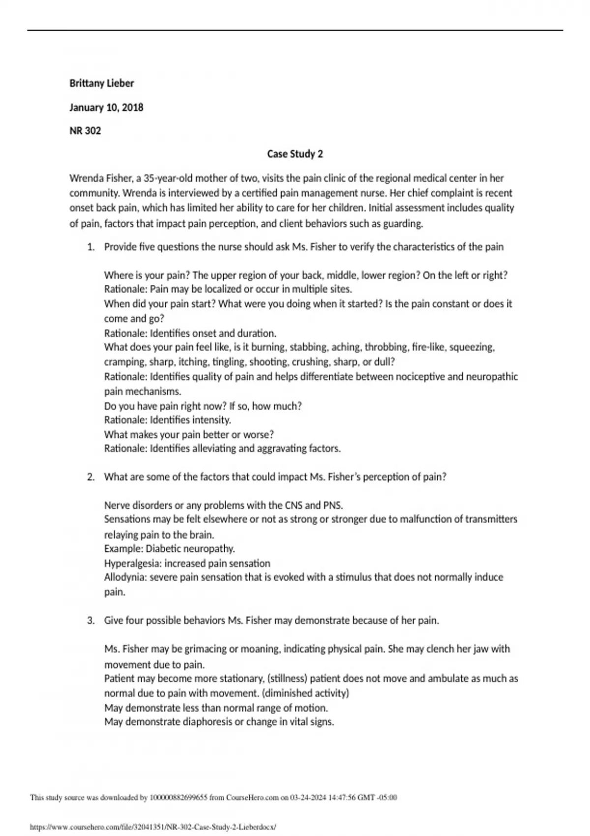 Case Study 2 Wrenda Fisher, a 35-year-old mother of two, visits the pain clinic of the regional medical center in her community. Wrenda is interviewed by a certified pain management nurse. Her chief complaint is recent onset back pain, which has limited her ability to care for her children. Initial assessment includes quality of pain, factors that impact pain perception, and client behav