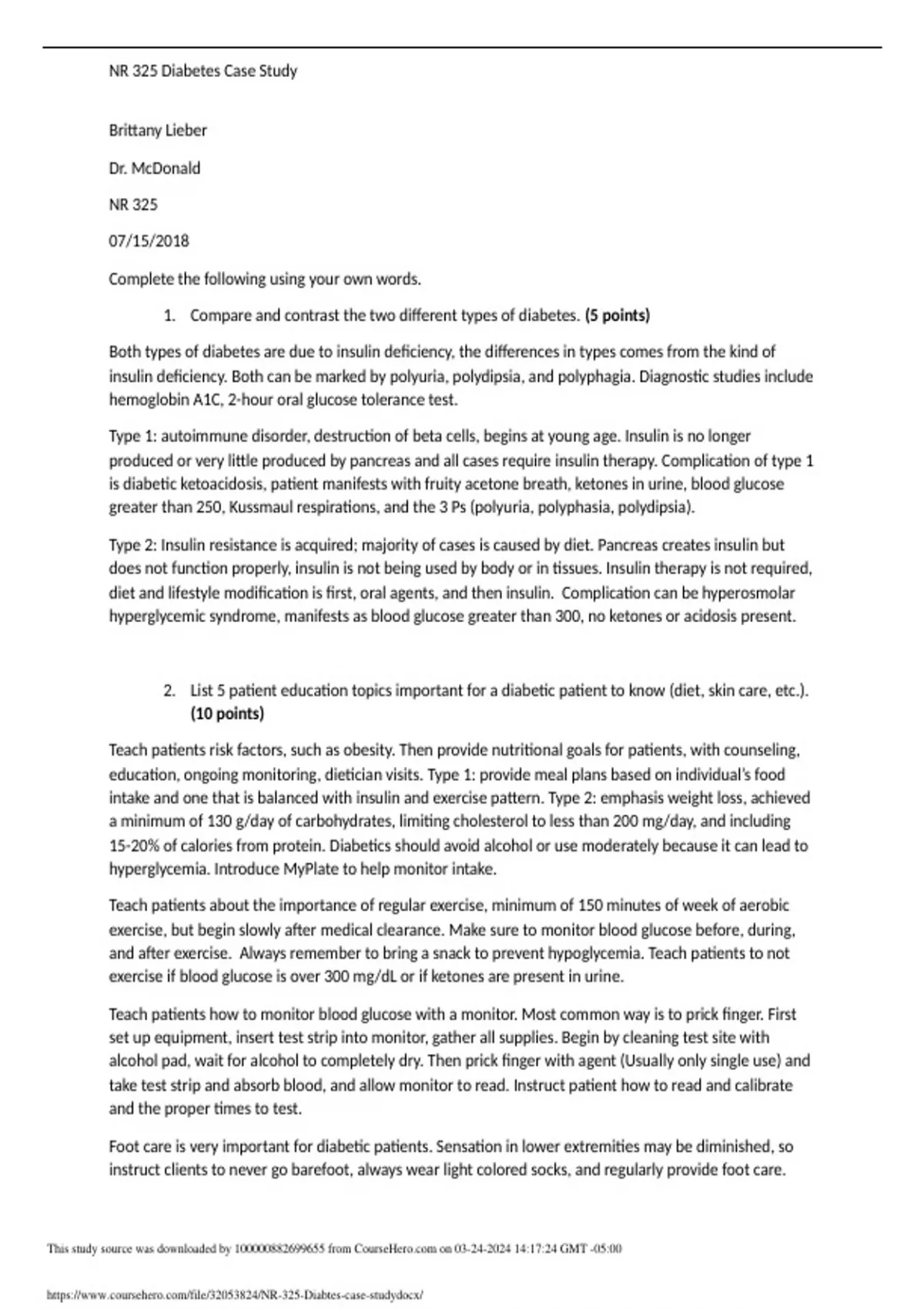 NR 325 Diabtes case study Elaborate and 100% Correct Answers