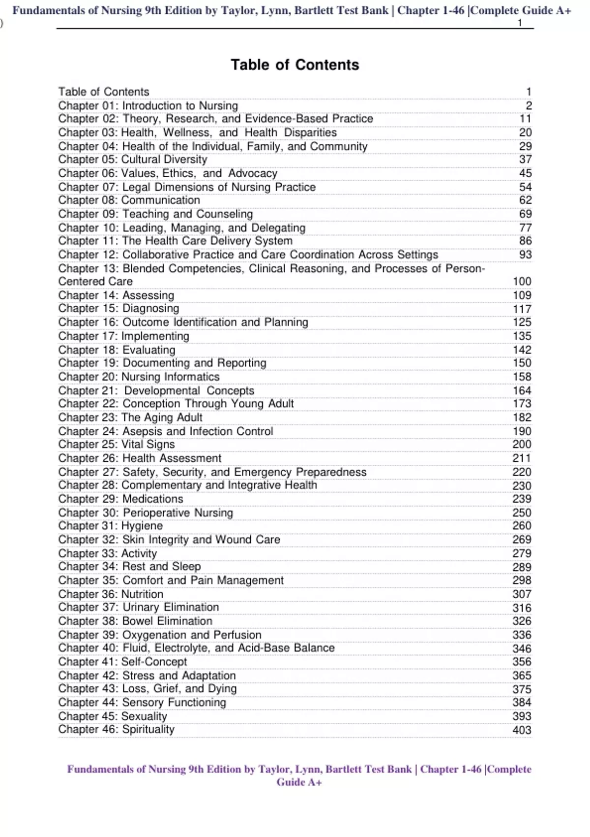 TEST BANK - FUNDAMENTALS OF NURSING (9TH EDITION BY TAYLOR) TEST BANK - FUNDAMENTALS OF NURSING (9TH EDITION BY TAYLOR) Table of Contents Table of Contents 1 Chapter 01: Introduction to Nursing Chapter 02: Theory, Research, and Evidence-Based Practice Chapter 03: Health, Wellness, and Health Disparities Chapter 04: Health of the Individual, Family, and Community Chapter 05: Cultural Diversity Chapter 06: Values, Ethics, and Advocacy Chapter 07: Legal Dimensions of Nursing Practice Chapter 08: Communication Chapter 09: Teaching and Counseling Chapter 10: Leading, Managing, and Delegating Chapter 11: The Health Care Delivery System Chapter 12: Collaborative Practice and Care Coordination Across Settings Chapter 13: Blended Competencies, Clinical Reasoning, and Processes of Person- Centered Care Chapter 14: Assessing Chapter 15: Diagnosing Chapter 16: Outcome Identification and Planning Chapter 17: Implementing Chapter 18: Evaluating Chapter 19: Documenting and Reporting Chapter 20: Nursing Informatics Chapter 21: Developmental Concepts Chapter 22: Conception Through Young Adult Chapter 23: The Aging Adult Chapter 24: Asepsis and Infection Control Chapter 25: Vital Signs Chapter 26: Health Assessment Chapter 27: Safety, Security, and Emergency Preparedness Chapter 28: Complementary and Integrative Health Chapter 29: Medications Chapter 30: Perioperative Nursing Chapter 31: Hygiene Chapter 32: Skin Integrity and Wound Care Chapter 33: Activity Chapter 34: Rest and Sleep Chapter 35: Comfort and Pain Management Chapter 36: Nutrition Chapter 37: Urinary Elimination Chapter 38: Bowel Elimination Chapter 39: Oxygenation and Perfusion Chapter 40: Fluid, Electrolyte, and Acid-Base Balance Chapter 41: Self-Concept Chapter 42: Stress and Adaptation Chapter 43: Loss, Grief, and Dying Chapter 44: Sensory Functioning Chapter 45: Sexuality Chapter 46: Spirituality 403 Chapter 01: Introduction to Nursing 1. Which of the following statements accurately describe an element of nursing? Select all that apply. A) The skills involved in nursing are primarily technical in nature. B) The primary focus of nursing is to assist individuals to recover from illness. C) The science of nursing is the knowledge base for the care that is given. D) The art of nursing is the collection of knowledge through research. E) Nursing is considered to be both an art and a science. F) Nursing is a profession that used specialized knowledge and skills. 2. Which of the following set of terms best describes nursing at the end of the Middle Ages? A) continuity, caring, critical thinking B) purpose, direction, leadership C) assessment, interventions, outcomes D) advocacy, research, education 3. Which of the following is a characteristic of nursing practiced from early civilization to the 16th century? A) Most early civilizations believed that illness had supernatural causes. B) The physician was the priest who treated disease with prayer. C) The nurse was a nun committed to caring for the needy and homeless. D) Nursing changed from a spiritual focus to an emphasis on knowledge expansion. 4. In what time period did nursing care as we now know it begin? A) pre-civilization B) early civilization to 16th century
