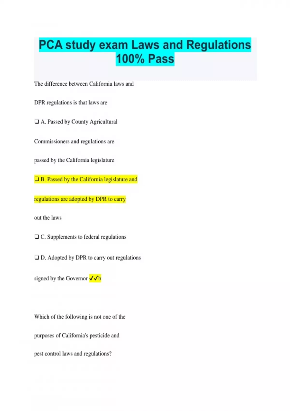 PCA study exam Laws and Regulations 100% Pass The difference between California laws and DPR regulations is that laws are A. Passed by County Agricultural Commissioners and regulations are passed by the California legislature B. Passed by the California legislature and regulations are adopted by DPR to carry out the laws C. Supplements to federal regulations D. Adopted by DPR to carry out regulations signed by the Governor b Which of the following is not one of the purposes of California's pesticide and pest control laws and regulations? A. Protecting workers from pesticide exposure B. Providing proper, safe, and effective use of pesticides C. Encouraging people to use more pesticides D. Protecting public health and safety c A cooperating agency that helps DPR enforce pesticide use laws and regulations in California is the A. County Department of Health B. State Department of Water Resources C. State Department of Labor D. County Agricultural Commissioner D County Agricultural Commissioners may adopt supplemental pesticide regulations with the approval of the A. Department of Pesticide Regulation B. Office of the Governor C. County Board of Supervisors D. California State Legislature A Which of the following is considered to be pesticide labeling? A. Spray nozzle catalog B. A printed pesticide advertisement C. The federal Worker Protection Standard D. A written recommendation c When a pesticide registrant allows a pesticide product registration to lapse, pest control dealers A. Must immediately return all unsold stock B. Can sell and deliver the pesticide product for two years C. Must retrieve all previously sold stock D. Can indefinitely sell and deliver the pesticide product B When a pesticide product registration is cancelled, the sale and use of this product A. Is automatically prohibited under all circumstances B. May continue under conditions imposed by the regulatory agency responsible for the cancellation C. Will be allowed for two years from the cancellation date D. Is not affected as long as detailed sales records are kept current B A Special Local Need Registration (SLN) allows A. Growers to apply the pesticide to any crop as long as the SLN is valid in the grower's state B. Supplemental uses of the pesticide uniformly throughout the U.S. C. Uses of pesticides for crops or sites not listed on the label D. Any feasible use of the pesticide in the specified local area C Which of the following is considered