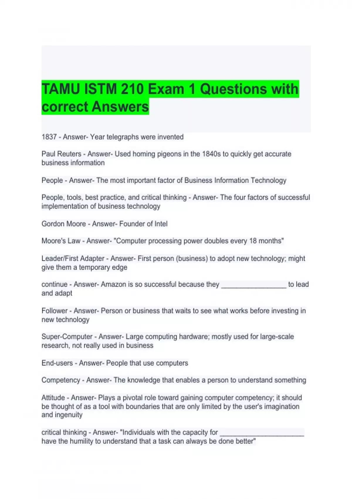 tamu istm 210 exam 1 questions with correct answer