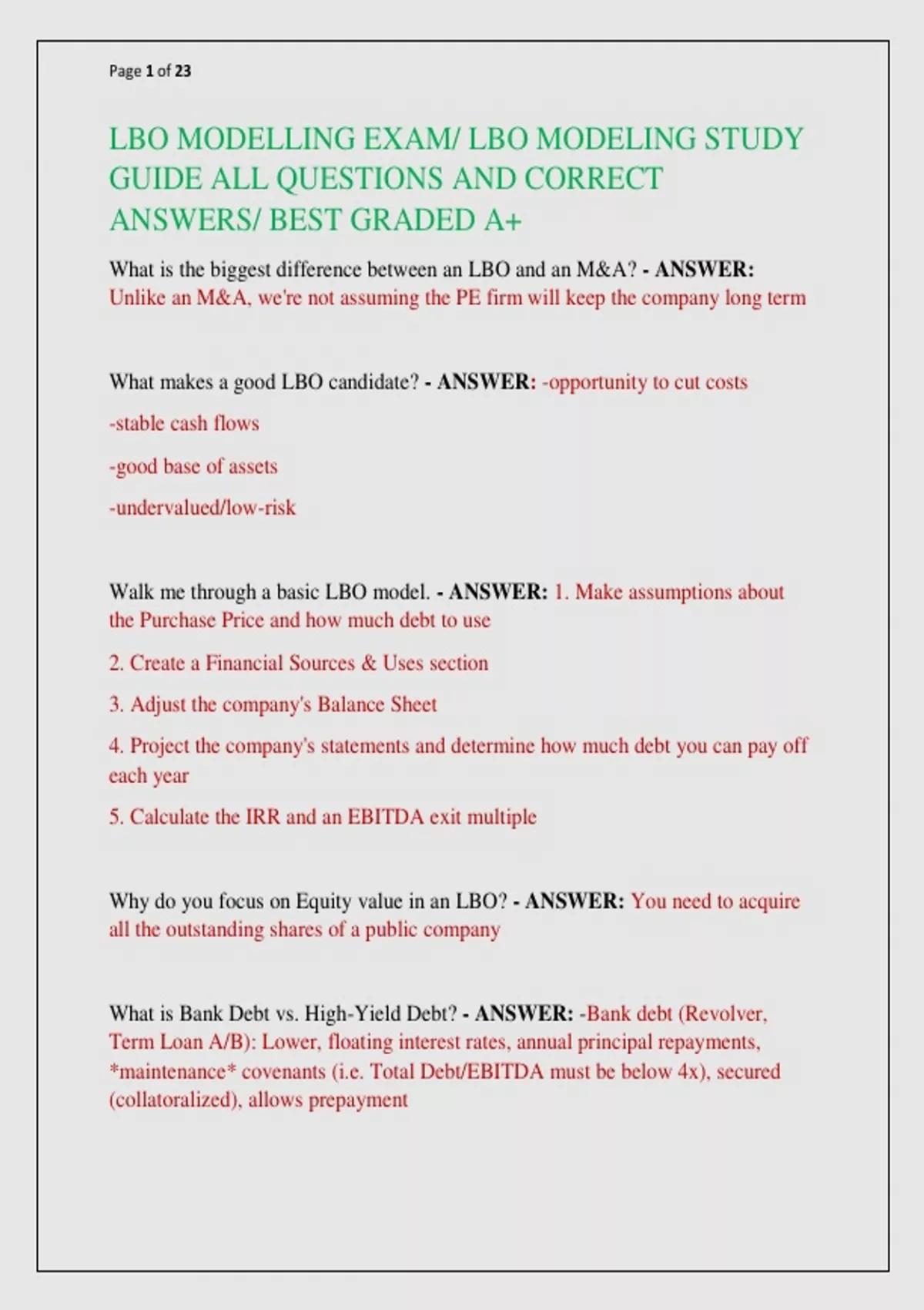 LBO MODELLING EXAM/ LBO MODELING STUDY GUIDE ALL QUESTIONS AND CORRECT ANSWERS/ BEST GRADED A+