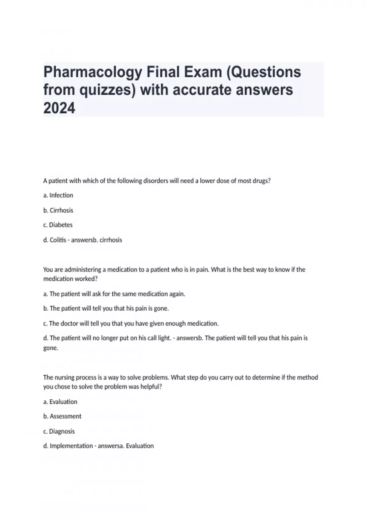 A patient with which of the following disorders will need a lower dose of most drugs? a. Infection b. Cirrhosis c. Diabetes d. Colitis - answersb. cirrhosis You are administering a medication to a patient who is in pain. What is the best way to know if the medication worked? a. The patient will ask for the same medication again. b. The patient will tell you that his pain is gone. c. The doctor will tell you that you have given enough medication. d. The patient will no longer put on his call light. - answersb. The patient will tell you that his pain is gone. The nursing process is a way to solve problems. What step do you carry out to determine if the method you chose to solve the problem was helpful? a. Evaluation b. Assessment c. Diagnosis d. Implementation - answersa. Evaluation A current concern with elderly patients is the risk of increased adverse reactions and interactions when many different drugs are taken at once. This is called a. Synergism b. Tolerance c. Interdependence d. Polypharmacy - answersd. Polypharmacy A PRN medication order gives the nurse discretion regarding when to give the drug within the ordered parameters. Select one: True False - answersTrue What is the usual order of the nursing process? Select one: a. Assessment, Diagnosis, Planning, Implementation, Evaluation b. Diganosis, Evaluation, Assessment, Implementation, Planning c. Planning, Implementation, Diagnosis, Evaluation, Assessment d. Assessment, Evaluation, Diagnosis, Planning, Implementation - answersa. Assessment, Diagnosis, Planning, Implementation, Evaluation The patient's family has asked the doctor to make the patient comfortable but the patient wants to stay alert. The doctor has ordered Morphine 15 mg every 3 hours prn for pain. The patient is refusing to take the drug. How can you respond to the family and demonstrate support for the patient's autonomy? Select one: a. "I appreciate your concern but your father has told me that he does not want the drug." b. "I can see that your dad is having pain; I will prepare the drug." c. "I will tell your father that you are requesting that he take his drugs for pain." d. "Your father probably doesn't know what he is saying; I will get the drug for him." - answersa. "I appreciate your concern but your father has told me that he does not want the drug." The nurse is gathering assessment data for a patient's drug history. The patient states "I am not able to swallow pills." This is an example of which type of data? Select one: a. Objective b. Subjective - answersb. Subjective Creams and ointments used for skin lesions exert primarily a(an): Select one: a. local effect. b. systemic effect. - answersa. local effect Morphine has a high first pass effect. What are the implications of this for a patient receiving oral morphine for pain? Select one: a. The patient will need a lower dose of oral morphine than IV morphine. b. The patient will need the same amount of IV or oral morphine. c. The patient will need a higher dose of oral morphine than IV morphine. - answersc. The patient will need a higher dose of oral morphine than IV morphine Once a drug is administered, it is distributed throughout the body by the: Select one: a. blood. b. liver. c. kidneys. d. GI mucosa - answersa. blood The nurse is preparing to give a patient amlodipine/benazepril (Lotrel) an antihypertensive medication. The patient's blood pressure has been in the 110/70 range the last 3 days which is normal. Prior to administering this medication the nurse should do which of the following? Select one: a. Check the patient's heart rate. b. Check the patient's blood pressure. c. Call the physician and inquire why the medication is being given. d. Hold the medication for further clarification. - answersb. Check the patient's blood pressure. Which information is most important to collect when assessing for allergies? Select one: a. The date of the last reaction. b. Whether or not the physician was contacted after the reaction. c. If there is a supply of Benadryl in the home. d. What the allergy is to and what type of reaction was experienced. - answersd. What the allergy is to and what type of reaction was experienced. Most drugs are excreted by which route? Select one: a. Urinary b. Bowel c. Respiratory d. Oral - answersa. Urinary Older adult patients often need lower drug doses. Which of the following statements best explains why this occurs? Select one: a. Older people are at risk for drug tolerance. b. Older people may have altered GI function and an inability to absorb and distribute medications. c. Older people have diminished liver and kidney function, which will slow metabolism and excretion of medications. d. Older people are at risk for polypharmacy, which can lead to dependence and addiction. - answersc. Older people have diminished liver and kidney function, which will slow metabolism and excretion of medications. A patient has been on bronchodilator inhalers for 10 years. Over the years, he has had to increase the dose and frequency of the inhalers to achieve the same effect. This is an example of: Select one: a. drug dependence. b. drug tolerance. c. drug abuse. d. idiosyncratic action. - answersb. drug tolerance A patient is malnourished with an albumin level of 2.6 (normal is 3.2-4.5 g/dl). Low serum albumin may affect the patient's medication dosage needs because: Select one: a. low serum albumin will impair liver function, thereby reducing metabolism of the drug. b. low serum albumin will cause increased protein loss by the kidneys, thereby affecting excretion of the drugs. c. less serum protein will be available for medication binding, so less free drug will be available. d. less serum protein will be available for medication binding, and more free drug will be available. - answersd. less serum protein will be available for medication binding, and more free drug will be available It is important to know what the patient eats and drinks because certain foods, beverages, alcohol, caffe