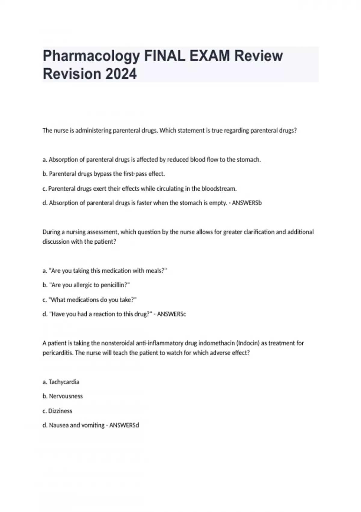 The nurse is administering parenteral drugs. Which statement is true regarding parenteral drugs? a. Absorption of parenteral drugs is affected by reduced blood flow to the stomach. b. Parenteral drugs bypass the first-pass effect. c. Parenteral drugs exert their effects while circulating in the bloodstream. d. Absorption of parenteral drugs is faster when the stomach is empty. - ANSWERSb During a nursing assessment, which question by the nurse allows for greater clarification and additional discussion with the patient? a. "Are you taking this medication with meals?" b. "Are you allergic to penicillin?" c. "What medications do you take?" d. "Have you had a reaction to this drug?" - ANSWERSc A patient is taking the nonsteroidal anti-inflammatory drug indomethacin (Indocin) as treatment for pericarditis. The nurse will teach the patient to watch for which adverse effect? a. Tachycardia b. Nervousness c. Dizziness d. Nausea and vomiting - ANSWERSd A patient with a severe fungal infection has orders for voriconazole (Vfend). The nurse is reviewing the patient's medical record and would be concerned if which assessment finding is noted? a. Decreased breath sounds in the lower lobes b. Potassium level of 4.0 mEq/L c. History of type 2 diabetes d. History of cardiac dysrhythmias - ANSWERSd The patient is experiencing chest pain and needs to take a sublingual form of nitroglycerin. Where does the nurse instruct the patient to place the tablet? a. On top of the tongue b. At the back of the throat c. In the space between the cheek and the gum d. Under the tongue - ANSWERSd The nurse notes in a patient's medication history that the patient is taking allopurinol (Zyloprim). Based on this finding, the nurse interprets that the patient has which disorder? a. Osteoarthritis b. Gout c. Rheumatoid arthritis d. Systemic lupus erythematosus - ANSWERSb Which nursing diagnosis is appropriate for the patient who has just received a prescription for a new medication? a. Lack of knowledge regarding newly prescribed drug therapy b. Impaired memory related to new drug therapy c. Noncompliance related to new drug therapy d. Deficient knowledge related to newly prescribed drug therapy - ANSWERSd The nurse is monitoring for therapeutic results of antibiotic therapy in a patient with an infection. Which laboratory value would indicate therapeutic effectiveness of this therapy? a. Increased hemoglobin level b. Decreased platelet count c. Increased red blood cell count d. Decreased white blood cell count - ANSWERSd When given an intravenous medication, the patient says to the nurse, "I usually take pills. Why does this medication have to be given in the arm?" What is the nurse's best answer? a. "The intravenous medication will have delayed absorption into the body's tissues." b. "The action of the medication will begin sooner when given intravenously." c. "The medication will cause fewer adverse effects when given intravenously." d. "There is a lower chance of allergic reactions when drugs are given intravenously." - ANSWERSb A patient has a urinary tract infection. The nurse knows that which class of drugs is especially useful for such infections? a. Macrolides b. Sulfonamides c. Carbapenems d. Tetracyclines - ANSWERSb During a busy night shift, a new nurse administered an unfamiliar medication without checking it in a drug handbook. Later that day, the patient had a severe reaction because he has renal problems, which was a contraindication to that drug. The nurse may be liable for which of these? a. Autonomy b. Nonmaleficence c. Nursing negligence d. Medical negligence - ANSWERSc The nurse is providing counseling to a woman who is HIV positive and has just discovered that she is pregnant. Which anti-HIV drug is given to HIV-infected pregnant women to prevent transmission of the virus to the infant? a. Zidovudine (Retrovir) b. Acyclovir (Zovirax) c. Foscarnet (Foscavir) d. Ribavirin (Virazole) - ANSWERSa Which are appropriate considerations when the nurse is assessing the learning needs of a patient? (Select all that apply.) a. Health beliefs b. Level of education c. Family history d. Readiness to learn e. Cultural background - ANSWERSa, b, d, e A patient is receiving hydroxychloroquine therapy but tells the nurse that she has never traveled out of her city. The nurse knows that a possible reason for this drug therapy is which condition? a. Intestinal tapeworms b. Lyme disease c. Systemic lupus erythematosus d. Toxoplasmosis - ANSWERSc A patient who has been hospitalized for 2 weeks has developed a pressure ulcer that contains multidrug-resistant Staphylococcus aureus (MRSA). Which drug would the nurse expect to be chosen for therapy? a. Vancomycin (Vancocin) b. Metronidazole (Flagyl) c. Ciprofloxacin (Cipro) d. Tobramycin (Nebcin) - ANSWERSa A patient who has advanced cancer is receiving opioid medications around the clock to keep him comfortable as he nears the end of his life. Which term best describes this type of therapy? a. Supplemental therapy b. Maintenance therapy c. Palliative therapy d. Empiric therapy - ANSWERSc The nurse will be injecting a drug into the fatty tissue of the patient's abdomen. Which route does this describe? a. Subcutaneous b. Transdermal c. Intradermal d. Intramuscular - ANSWERSa The nurse is reviewing the applications of gene therapy. Which drug is manufactured as a result of indirect gene therapy? a. Human insulin b. Heparin c. Vitamin K d. Warfarin - ANSWERSa The nurse is assessing a newly admitted 83-year-old patient and determines that the patient is experiencing polypharmacy. Which statement most accurately illustrates polypharmacy? a. The patient uses over-the-counter drugs for an illness. b. The patient is experiencing multiple illnesses. c. The patient uses one medication for an illness several times per day. d. The patient uses multiple medications simultaneously. - ANSWERSd The nurse is administering an amphotericin B infusion. Which actions by the nurse are appropriate? (Selec