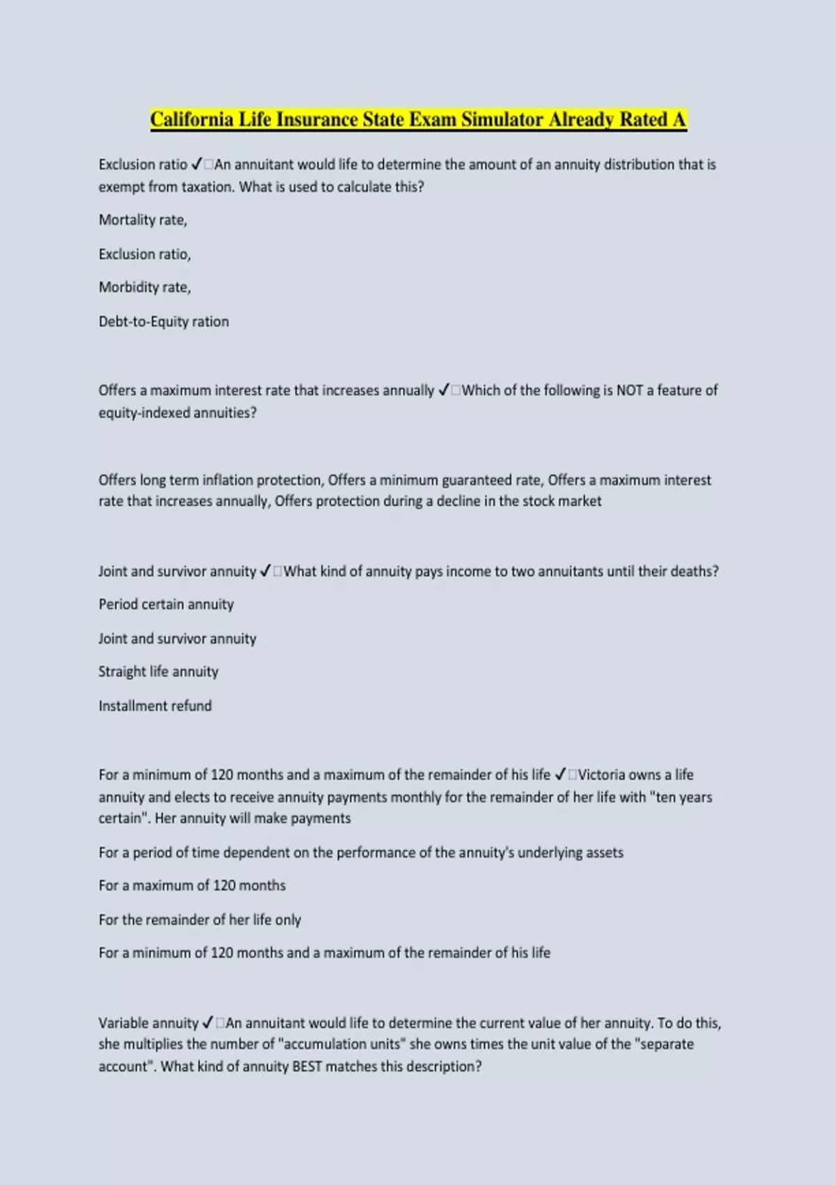 California Life Insurance State Exam Simulator Already Rated A Exclusion ratio ️An annuitant would life to determine the amount of an annuity distribution that is exempt from taxation. What is used to calculate this? Mortality rate, Exclusion ratio, Morbidity rate, Debt-to-Equity ration Offers a maximum interest rate that increases annually ️Which of the following is NOT a feature of equity-indexed annuities? Offers long term inflation protection, Offers a minimum guaranteed rate, Offers a maximum interest rate that increases annually, Offers protection during a decline in the stock market Joint and survivor annuity ️What kind of annuity pays income to two annuitants until their deaths? Period certain annuity Joint and survivor annuity Straight life annuity Installment refund For a minimum of 120 months and a maximum of the remainder of his life ️Victoria owns a life annuity and elects to receive annuity payments monthly for the remainder of her life with "ten years certain". Her annuity will make payments For a period of time dependent on the performance of the annuity's underlying assets For a maximum of 120 months For the remainder of her life only For a minimum of 120 months and a maximum of the remainder of his life Variable annuity ️An annuitant would life to determine the current value of her annuity. To do this, she multiplies the number of "accumulation units" she owns times the unit value of the "separate account". What kind of annuity BEST matches this description? Variable annuity Fixed annuity Immediate annuity Life annuity 60 payments ️Cindy buys a 10-year annuity with an installment refund. After receiving monthly payments for 5 years, Cindy dies. How many remaining payments will the insurer make to her beneficiary? No payments 30 payments 60 payments 120 payments To protect against the risk of outliving their financial resources ️What is a common reason people purchase an annuity? To create an immediate estate To pay off a debt in the event of death To minimize their tax burden To protect against the risk of outliving their financial resources Variable annuity ️An annuity which is backed by a life insurer's separate account is called a(n) Equity indexed annuity Variable annuity Immediate annuity 403(b) plan The time at which benefit payments start ️What distinguishes a deferred annuity from an immediate annuity? The time at which benefit payments start The benefit payment amount The taxation of benefit payments The age at which the annuity can be purchased Deferred annuity ️A savings vehicle designed to first accumulate funds and then systematically liquidates the funds is called a(n) Immediate annuity Deferred annuity Endowment Whole life policy Insurance policy ️Which of the following is a contract that involves one party which indemnifies another when a loss arises from an unknown event? Insurance policy Loss contract Warranty arrangement Indemnification arrangement Mutual insurer ️A participating company is also referred to as which type of insurer? Reciprocal insurer Re-insurer Mutual insurer Domestic insurer Reinsurance ️An insurer enters into a contract with a third party to insure itself against losses from insurance policies it issues. What is this agreement called? Reinsurance Mutual Multi-line Reserves Primary insurer ️AAA Insurance Company has transferred a portion of its loss exposure to BBB Insurance Company. In this reinsurance transaction, what is AAA Insurance Company called? Tertiary insurer Primary insurer Secondary insurer Captive insurer Contract that allows the policyowner to receive a share of surplus in the form of policy dividends ️What is a participating life insurance policy? Contract that gives beneficiaries the right to participate in any dividends Agreement that insures two or more lives Agreement that allows two or more beneficiaries to share in the death benefit Contract that allows the policyowner to receive a share of surplus in the form of policy dividends Participating ️John owns an insurance policy that gives him the right to share in the insurer's surplus. What kind of policy is this? Contributory Nonparticipating Surplus Participating Increases the unearned premium reserve ️Which of the following is NOT a characteristic of reinsurance? Protects against a very large claim Increases the unearned premium reserve A specialized branch of the insurance industry Enables insurer to meet certain objectives Marketing ️One important function of an insurance company is to identify and sell to potential