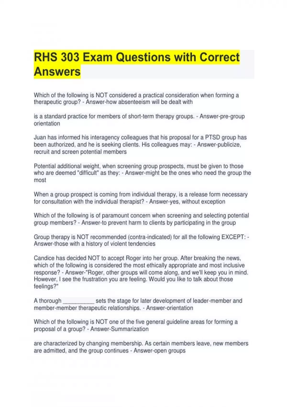 RHS 303 Exam Questions with Correct Answers Which of the following is NOT considered a practical consideration when forming a therapeutic group? - Answer-how absenteeism will be dealt with is a standard practice for members of short-term therapy groups. - Answer-pre-group orientation Juan has informed his interagency colleagues that his proposal for a PTSD group has been authorized, and he is seeking clients. His colleagues may: - Answer-publicize, recruit and screen potential members Potential additional weight, when screening group prospects, must be given to those who are deemed "difficult" as they: - Answer-might be the ones who need the group the most When a group prospect is coming from individual therapy, is a release form necessary for consultation with the individual therapist? - Answer-yes, without exception Which of the following is of paramount concern when screening and selecting potential group members? - Answer-to prevent harm to clients by participating in the group Group therapy is NOT recommended (contra-indicated) for all the following EXCEPT: - Answer-those with a history of violent tendencies Candice has decided NOT to accept Roger into her group. After breaking the news, which of the following is considered the most ethically appropriate and most inclusive response? - Answer-"Roger, other groups will come along, and we'll keep you in mind. However, I see the frustration you are feeling. Would you like to talk about those feelings?" A thorough __________ sets the stage for later development of leader-member and member-member therapeutic relationships. - Answer-orientation Which of the following is NOT one of the five general guideline areas for forming a proposal of a group? - Answer-Summarization are characterized by changing membership. As certain members leave, new members are admitted, and the group continues - Answer-open groups typically have some time limitation, with the group meeting for a predetermined number of sessions. - Answer-closed groups When forming a proposal for a group, which of the five general guideline areas would you ask yourself the question: Is the physical location of the group easily accessible to all members? - Answer-Practical considerations
