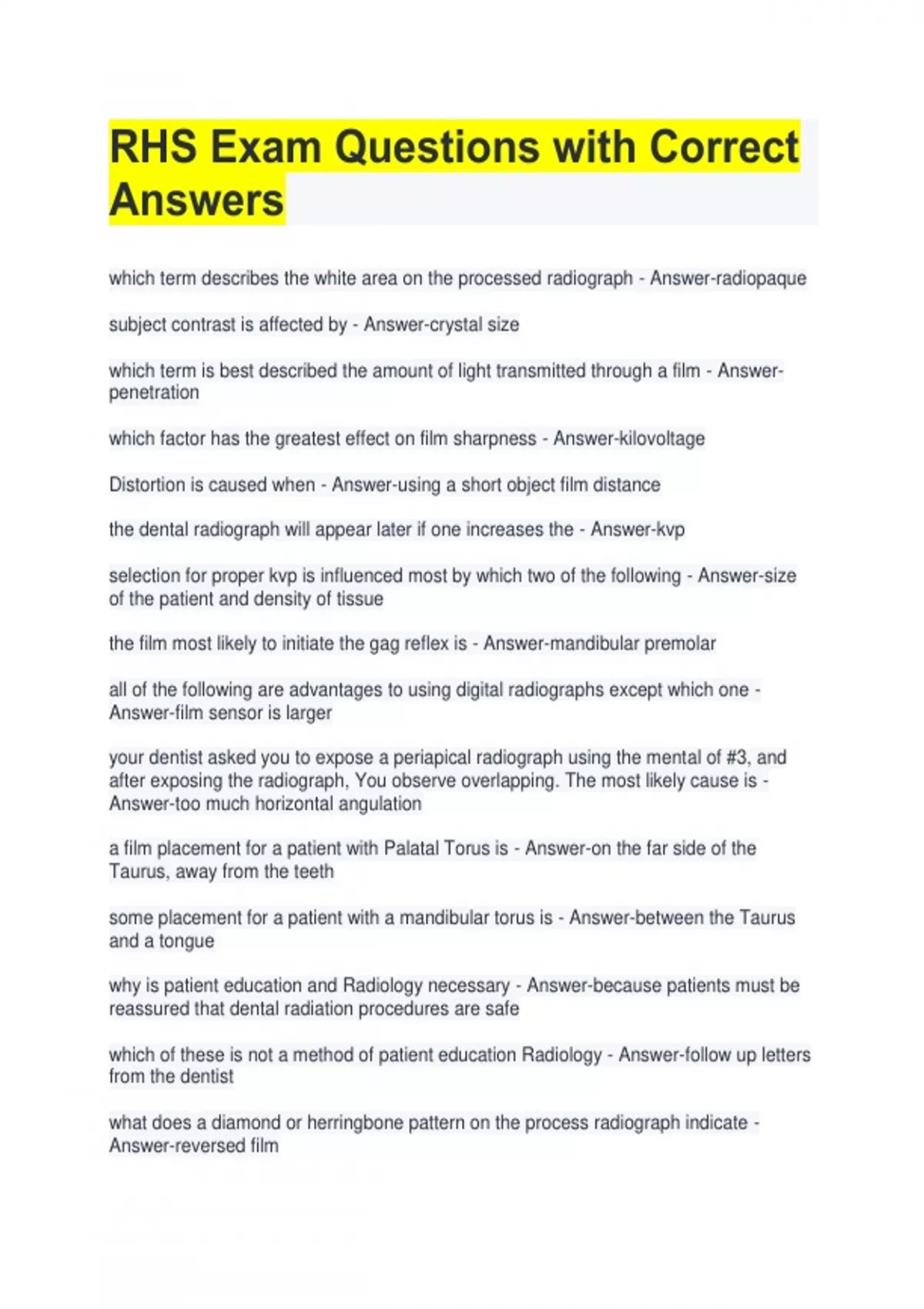 RHS Exam Questions with Correct Answers which term describes the white area on the processed radiograph - Answer-radiopaque subject contrast is affected by - Answer-crystal size which term is best described the amount of light transmitted through a film - Answerpenetration which factor has the greatest effect on film sharpness - Answer-kilovoltage Distortion is caused when - Answer-using a short object film distance the dental radiograph will appear later if one increases the - Answer-kvp selection for proper kvp is influenced most by which two of the following - Answer-size of the patient and density of tissue the film most likely to initiate the gag reflex is - Answer-mandibular premolar all of the following are advantages to using digital radiographs except which one - Answer-film sensor is larger your dentist asked you to expose a periapical radiograph using the mental of #3, and after exposing the radiograph, You observe overlapping. The most likely cause is - Answer-too much horizontal angulation a film placement for a patient with Palatal Torus is - Answer-on the far side of the Taurus, away from the teeth some placement for a patient with a mandibular torus is - Answer-between the Taurus and a tongue why is patient education and Radiology necessary - Answer-because patients must be reassured that dental radiation procedures are safe
