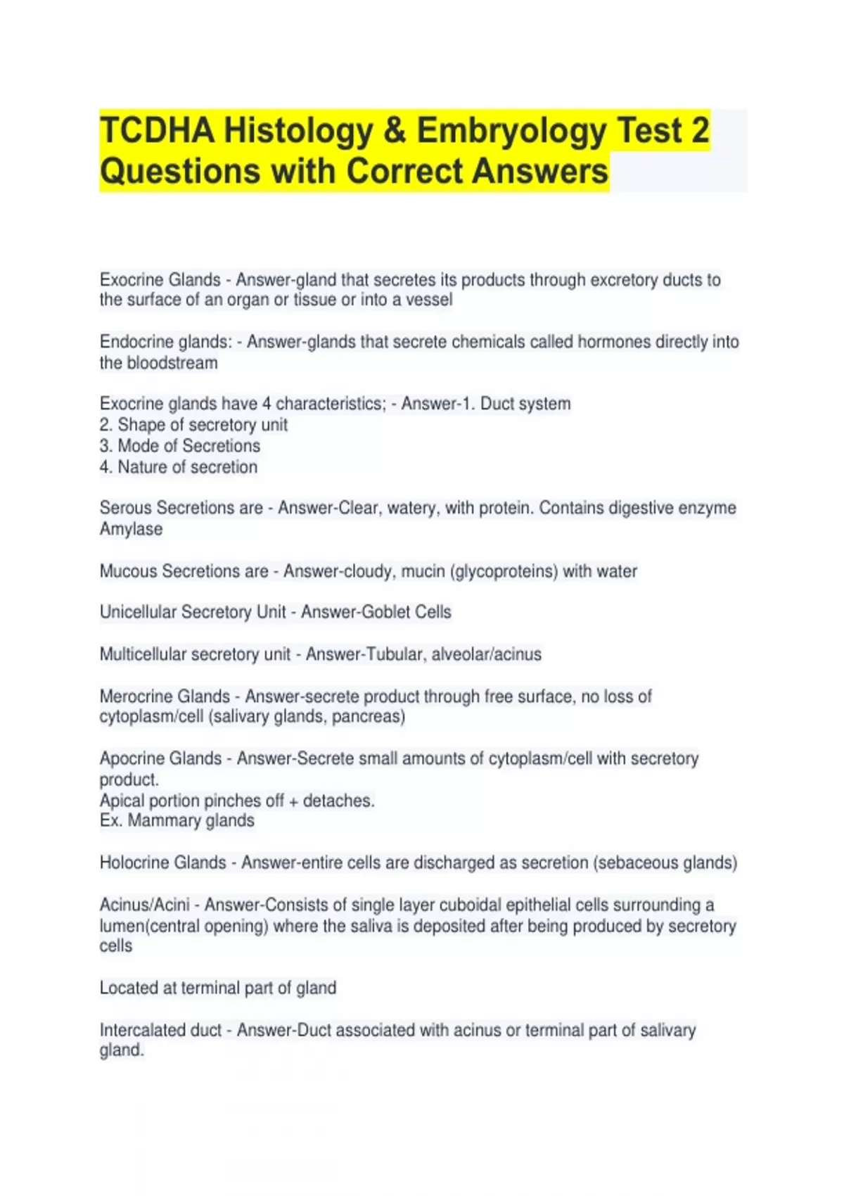 TCDHA Histology & Embryology Test 2 Questions with Correct Answers Exocrine Glands - Answer-gland that secretes its products through excretory ducts to the surface of an organ or tissue or into a vessel Endocrine glands: - Answer-glands that secrete chemicals called hormones directly into the bloodstream Exocrine glands have 4 characteristics; - Answer-1. Duct system 2. Shape of secretory unit 3. Mode of Secretions 4. Nature of secretion Serous Secretions are - Answer-Clear, watery, with protein. Contains digestive enzyme Amylase Mucous Secretions are - Answer-cloudy, mucin (glycoproteins) with water Unicellular Secretory Unit - Answer-Goblet Cells Multicellular secretory unit - Answer-Tubular, alveolar/acinus Merocrine Glands - Answer-secrete product through free surface, no loss of cytoplasm/cell (salivary glands, pancreas) Apocrine Glands - Answer-Secrete small amounts of cytoplasm/cell with secretory product. Apical portion pinches off + detaches. Ex. Mammary glands Holocrine Glands - Answer-entire cells are discharged as secretion (sebaceous glands) Acinus/Acini - Answer-Consists of single layer cuboidal epithelial cells surrounding a lumen(central opening) where the saliva is deposited after being produced by secretory cells Located at terminal part of gland Intercalated duct - Answer-Duct associated with acinus or terminal part of salivary gland. Parotid Gland - Answer-Largest (Stensons Duct) Duct system consists of LONG intercalated ducts and SHORT striated ducts with basal striations. Serous secretion 25% salivary volume Mumps - Answer-viral infection of the parotid gland Submandibular Salivary Gland - Answer-Medium, capsulated gland Wharton's duct, opens under tongue near frenum at sublingual caruncle Duct system consists of SHORT intercalated ducts and LONG striated ducts with basal striations 60-65% salivary volume Mixed gland, but serous dominates Sublingual Salivary Gland - Answer-Under tongue Smallest, NO capsule Bartholins Duct Mixed, but mainly mucous 10% salivary volume