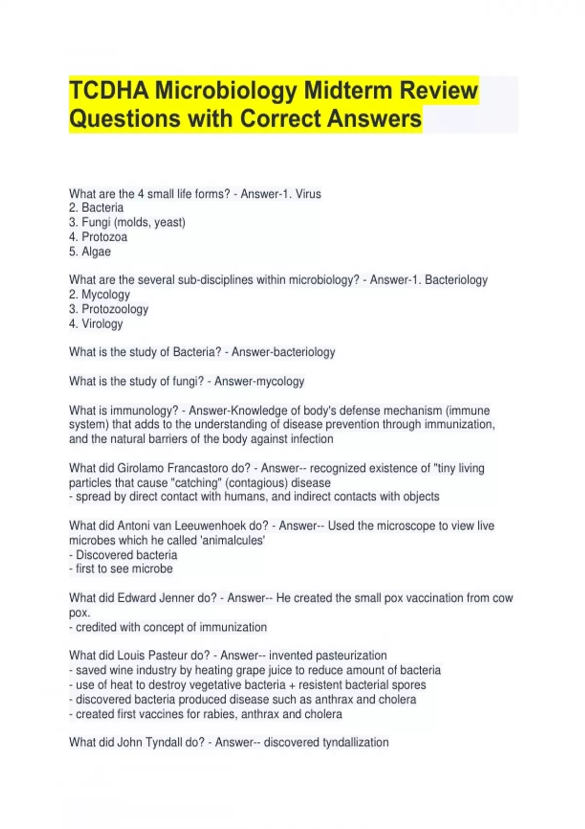 TCDHA Microbiology Midterm Review Questions with Correct Answers What are the 4 small life forms? - Answer-1. Virus 2. Bacteria 3. Fungi (molds, yeast) 4. Protozoa 5. Algae What are the several sub-disciplines within microbiology? - Answer-1. Bacteriology 2. Mycology 3. Protozoology 4. Virology What is the study of Bacteria? - Answer-bacteriology What is the study of fungi? - Answer-mycology What is immunology? - Answer-Knowledge of body's defense mechanism (immune system) that adds to the understanding of disease prevention through immunization, and the natural barriers of the body against infection What did Girolamo Francastoro do? - Answer-- recognized existence of "tiny living particles that cause "catching" (contagious) disease - spread by direct contact with humans, and indirect contacts with objects What did Antoni van Leeuwenhoek do? - Answer-- Used the microscope to view live microbes which he called 'animalcules' - Discovered bacteria - first to see microbe What did Edward Jenner do? - Answer-- He created the small pox vaccination from cow pox. - credited with concept of immunization What did Louis Pasteur do? - Answer-- invented pasteurization - saved wine industry by heating grape juice to reduce amount of bacteria - use of heat to destroy vegetative bacteria + resistent bacterial spores - discovered bacteria produced disease such as anthrax and cholera - created first vaccines for rabies, anthrax and cholera What did John Tyndall do? - Answer-- discovered tyndallization - discovered need for prolonged heating to destroy bacteria What are the 2 forms that bacteria exist? - Answer-- heat stable - heat sensitive What is tyndallization? - Answer-Prolong/ intermittent heat to destroy heatstable/sensitive bacteria What did Ferdinand Cohn do? - Answer-discovered endospores What are endospores? - Answer-Dormant form of bacteria w/ enhance resistance to heat, staining and disinfection What did Joseph Lister do? - Answer-Discovered role of airborne microorganisms Discovered that airborne mo's can be reduced w carbolic acid (phenols) What did Christian Gram do? - Answer-developed gram stain What is gram staining? - Answer-Determines differences in the cell wall 2 distinct groups - gram positive and gram negative What did Ignaz Semmelweis do? - Answer-Recognized importance of handwashing What did Sir Alexander Fleming discover? - Answer-penicillin What did Wendell Stanley do? - Answer-Developed electron microscope What did Robert Koch do? - Answer-identified the bacterium that causes tuberculosis, anthrax and cholera What are prokaryotic cells? - Answer-Primitive cells NO internal membrane NO nucleus What is bacteria? - Answer-prokaryote What is a eukaryotic cell? - Answer-Complex cells WITH internal membranes HAVE a nucleus What group do protozoa, algae, fungi, plants and animals belong to? - Answer Eukaryote