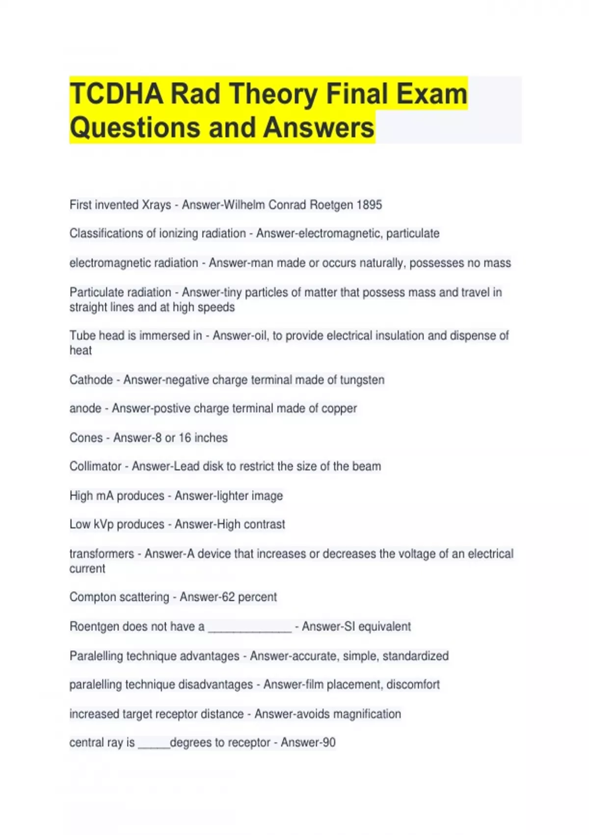 TCDHA Rad Theory Final Exam Questions and Answers First invented Xrays - Answer-Wilhelm Conrad Roetgen 1895 Classifications of ionizing radiation - Answer-electromagnetic, particulate electromagnetic radiation - Answer-man made or occurs naturally, possesses no mass Particulate radiation - Answer-tiny particles of matter that possess mass and travel in straight lines and at high speeds Tube head is immersed in - Answer-oil, to provide electrical insulation and dispense of heat Cathode - Answer-negative charge terminal made of tungsten anode - Answer-postive charge terminal made of copper Cones - Answer-8 or 16 inches Collimator - Answer-Lead disk to restrict the size of the beam High mA produces - Answer-lighter image Low kVp produces - Answer-High contrast transformers - Answer-A device that increases or decreases the voltage of an electrical current Compton scattering - Answer-62 percent Roentgen does not have a _____________ - Answer-SI equivalent Paralelling technique advantages - Answer-accurate, simple, standardized paralelling technique disadvantages - Answer-film placement, discomfort increased target receptor distance - Answer-avoids magnification central ray is _____degrees to receptor - Answer-90
