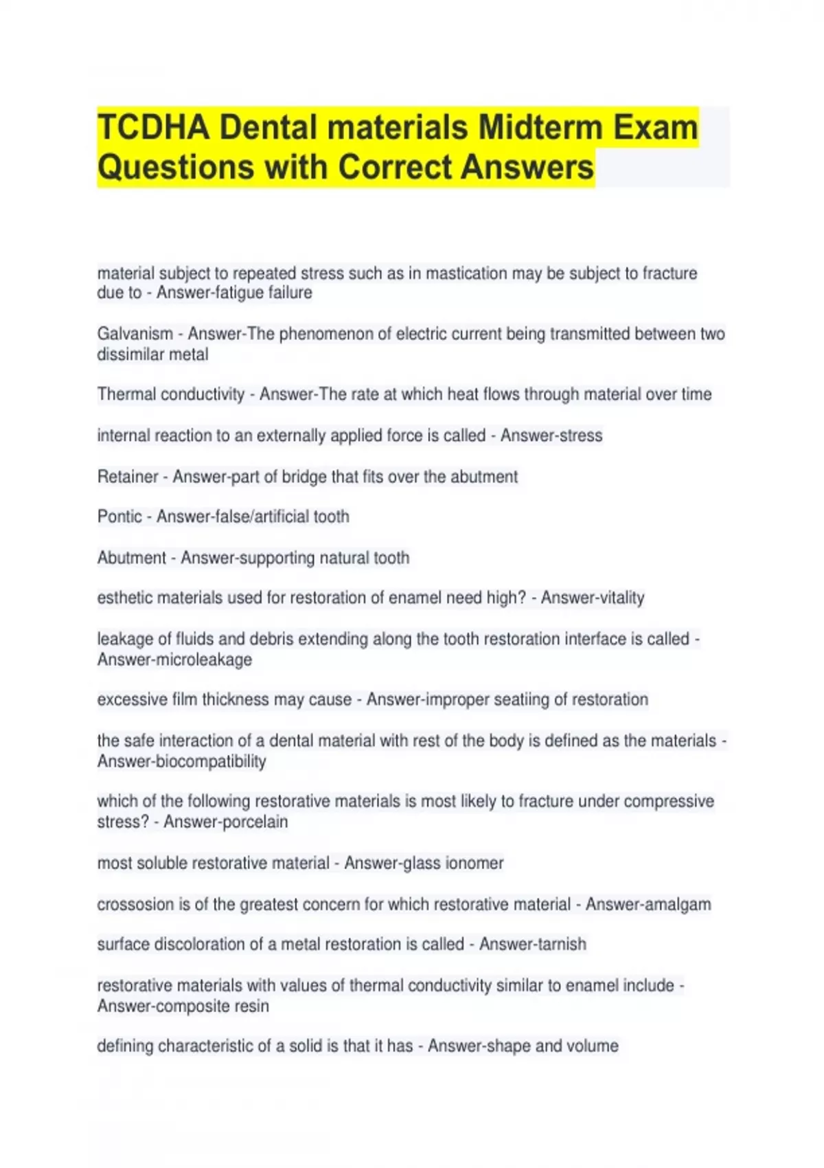 TCDHA Dental materials Midterm Exam Questions with Correct Answers material subject to repeated stress such as in mastication may be subject to fracture due to - Answer-fatigue failure Galvanism - Answer-The phenomenon of electric current being transmitted between two dissimilar metal Thermal conductivity - Answer-The rate at which heat flows through material over time internal reaction to an externally applied force is called - Answer-stress Retainer - Answer-part of bridge that fits over the abutment Pontic - Answer-false/artificial tooth Abutment - Answer-supporting natural tooth esthetic materials used for restoration of enamel need high? - Answer-vitality leakage of fluids and debris extending along the tooth restoration interface is called - Answer-microleakage excessive film thickness may cause - Answer-improper seatiing of restoration the safe interaction of a dental material with rest of the body is defined as the materials - Answer-biocompatibility which of the following restorative materials is most likely to fracture under compressive stress? - Answer-porcelain most soluble restorative material - Answer-glass ionomer crossosion is of the greatest concern for which restorative material - Answer-amalgam surface discoloration of a metal restoration is called - Answer-tarnish