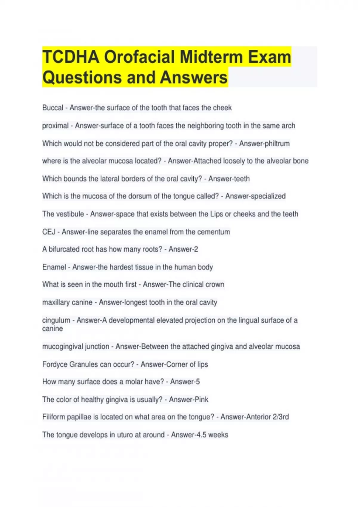 TCDHA Orofacial Midterm Exam Questions and Answers