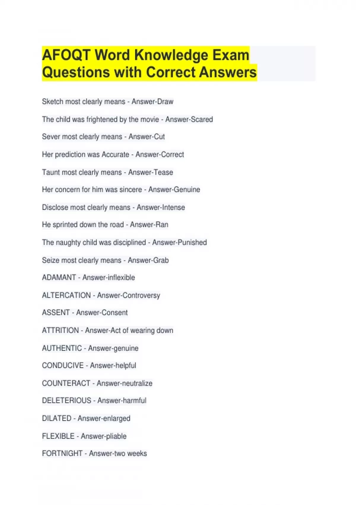 AFOQT Word Knowledge Exam Questions with Correct Answers Sketch most clearly means - Answer-Draw The child was frightened by the movie - Answer-Scared Sever most clearly means - Answer-Cut Her prediction was Accurate - Answer-Correct Taunt most clearly means - Answer-Tease Her concern for him was sincere - Answer-Genuine Disclose most clearly means - Answer-Intense He sprinted down the road - Answer-Ran The naughty child was disciplined - Answer-Punished Seize most clearly means - Answer-Grab ADAMANT - Answer-inflexible ALTERCATION - Answer-Controversy ASSENT - Answer-Consent ATTRITION - Answer-Act of wearing down AUTHENTIC - Answer-genuine CONDUCIVE - Answer-helpful COUNTERACT - Answer-neutralize DELETERIOUS - Answer-harmful DILATED - Answer-enlarged FLEXIBLE - Answer-pliable FORTNIGHT - Answer-two weeks