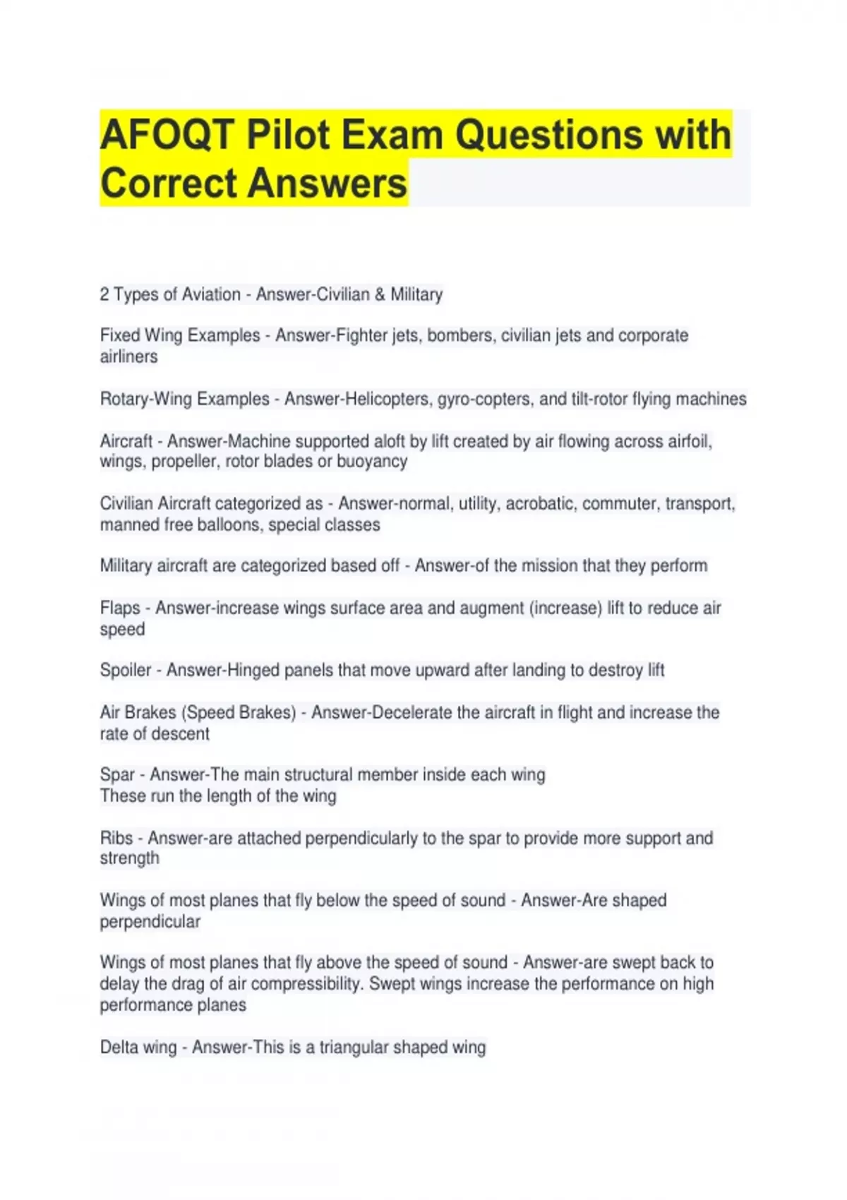 AFOQT Pilot Exam Questions with Correct Answers 2 Types of Aviation - Answer-Civilian & Military Fixed Wing Examples - Answer-Fighter jets, bombers, civilian jets and corporate airliners Rotary-Wing Examples - Answer-Helicopters, gyro-copters, and tilt-rotor flying machines Aircraft - Answer-Machine supported aloft by lift created by air flowing across airfoil, wings, propeller, rotor blades or buoyancy Civilian Aircraft categorized as - Answer-normal, utility, acrobatic, commuter, transport, manned free balloons, special classes Military aircraft are categorized based off - Answer-of the mission that they perform Flaps - Answer-increase wings surface area and augment (increase) lift to reduce air speed Spoiler - Answer-Hinged panels that move upward after landing to destroy lift Air Brakes (Speed Brakes) - Answer-Decelerate the aircraft in flight and increase the rate of descent Spar - Answer-The main structural member inside each wing These run the length of the wing Ribs - Answer-are attached perpendicularly to the spar to provide more support and strength Wings of most planes that fly below the speed of sound - Answer-Are shaped perpendicular Wings of most planes that fly above the speed of sound - Answer-are swept back to delay the drag of air compressibility. Swept wings increase the performance on high performance planes Delta wing - Answer-This is a triangular shaped wing Variable Geometry wings - Answer-The wings are positioned perpendicular at take off, landing and low air speeds, then move to a swept position when flying at high speeds Planes that take off and land on water have - Answer-Floats. They will take off and land on both water and land because they have retractable wheels 4 main aerodynamic forces acting on an aircraft when airborne - Answer-weight lift thrust drag Total weight force acts through the - Answer-Center of gravity
