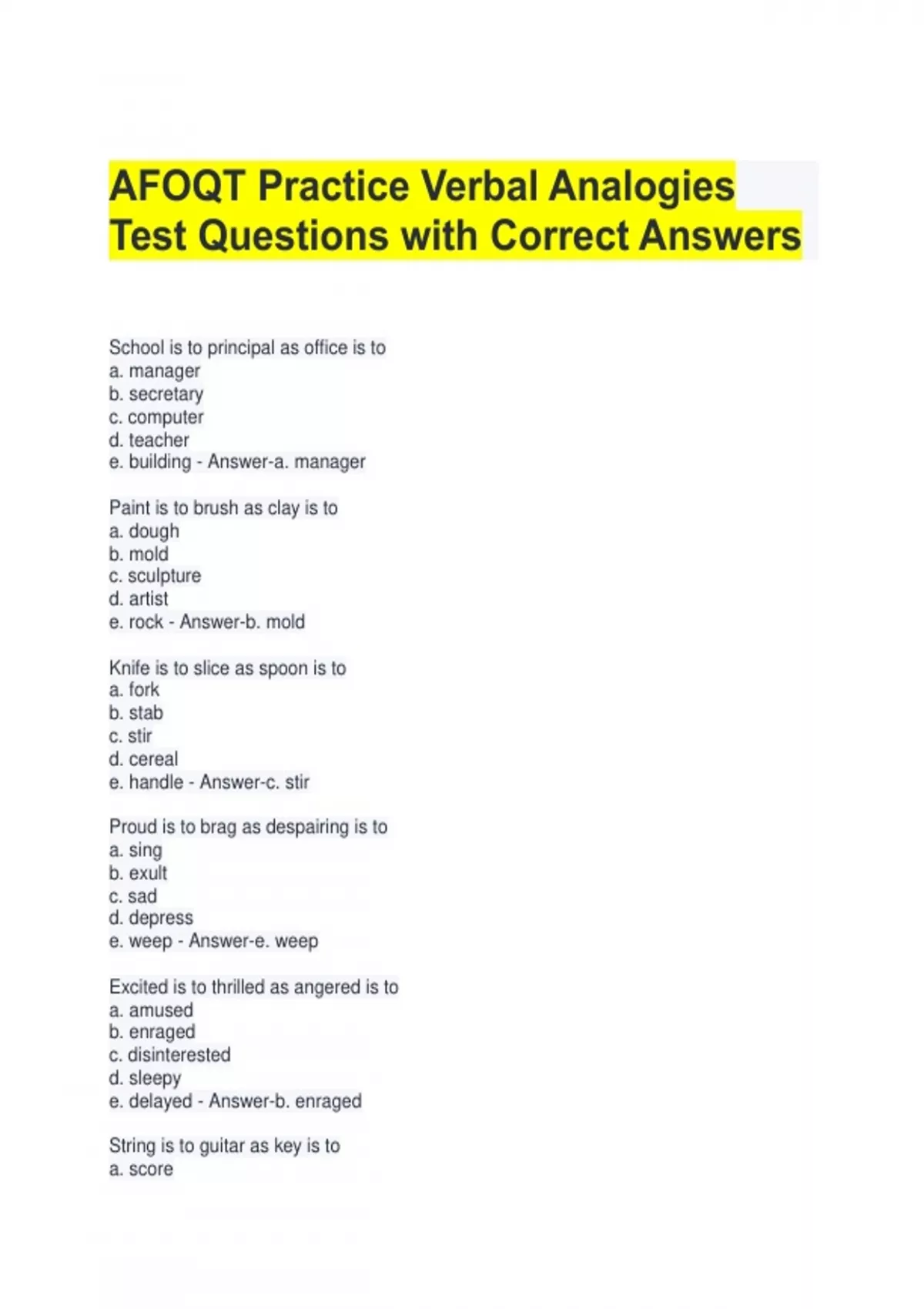 AFOQT Practice Verbal Analogies Test Questions with Correct Answers School is to principal as office is to a. manager b. secretary c. computer d. teacher e. building - Answer-a. manager Paint is to brush as clay is to a. dough b. mold c. sculpture d. artist e. rock - Answer-b. mold Knife is to slice as spoon is to a. fork b. stab c. stir d. cereal e. handle - Answer-c. stir Proud is to brag as despairing is to a. sing b. exult c. sad d. depress e. weep - Answer-e. weep Excited is to thrilled as angered is to a. amused b. enraged c. disinterested d. sleepy e. delayed - Answer-b. enraged String is to guitar as key is to a. score b. organ c. orchestra d. song e. drum - Answer-b. organ Thesaurus is to synonyms as dictionary is to a. words b. reference c. book d. volume e. definitions - Answer-e. definitions Pedestal is to bust as tripod is to a. film b. figure c. leg d. adjust e. camera - Answer-e. camera