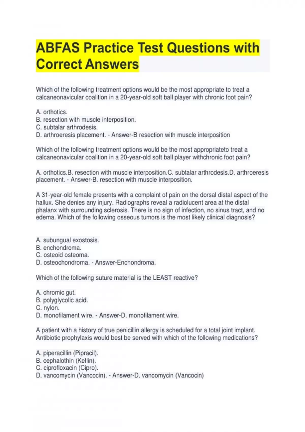 ABFAS Practice Test Questions with Correct Answers Which of the following treatment options would be the most appropriate to treat a calcaneonavicular coalition in a 20-year-old soft ball player with chronic foot pain? A. orthotics. B. resection with muscle interposition. C. subtalar arthrodesis. D. arthroeresis placement. - Answer-B resection with muscle interposition Which of the following treatment options would be the most appropriateto treat a calcaneonavicular coalition in a 20-year-old soft ball player withchronic foot pain? A. orthotics.B. resection with muscle interposition.C. subtalar arthrodesis.D. arthroeresis placement. - Answer-B. resection with muscle interposition. A 31-year-old female presents with a complaint of pain on the dorsal distal aspect of the hallux. She denies any injury. Radiographs reveal a radiolucent area at the distal phalanx with surrounding sclerosis. There is no sign of infection, no sinus tract, and no edema. Which of the following osseous tumors is the most likely clinical diagnosis? A. subungual exostosis. B. enchondroma. C. osteoid osteoma. D. osteochondroma. - Answer-Enchondroma. Which of the following suture material is the LEAST reactive? A. chromic gut. B. polyglycolic acid. C. nylon. D. monofilament wire. - Answer-D. monofilament wire. A patient with a history of true penicillin allergy is scheduled for a total joint implant. Antibiotic prophylaxis would best be served with which of the following medications? A. piperacillin (Pipracil). B. cephalothin (Keflin). C. ciprofloxacin (Cipro). D. vancomycin (Vancocin). - Answer-D. vancomycin (Vancocin) A 30 year old patient presents complaining of continued pain in the area of the plantar first metatarsal head for 2 weeks after hiking. Radiographs are inconclusive. Which of the following studies would be the mosthelpful to differentiate between sesamoiditis and a sesamoid fracture? A. bone scan.B. contra lateral foot radiograph.C. magneticresonance imaging.D. ultrasound. - Answer-C. magneticresonance imaging