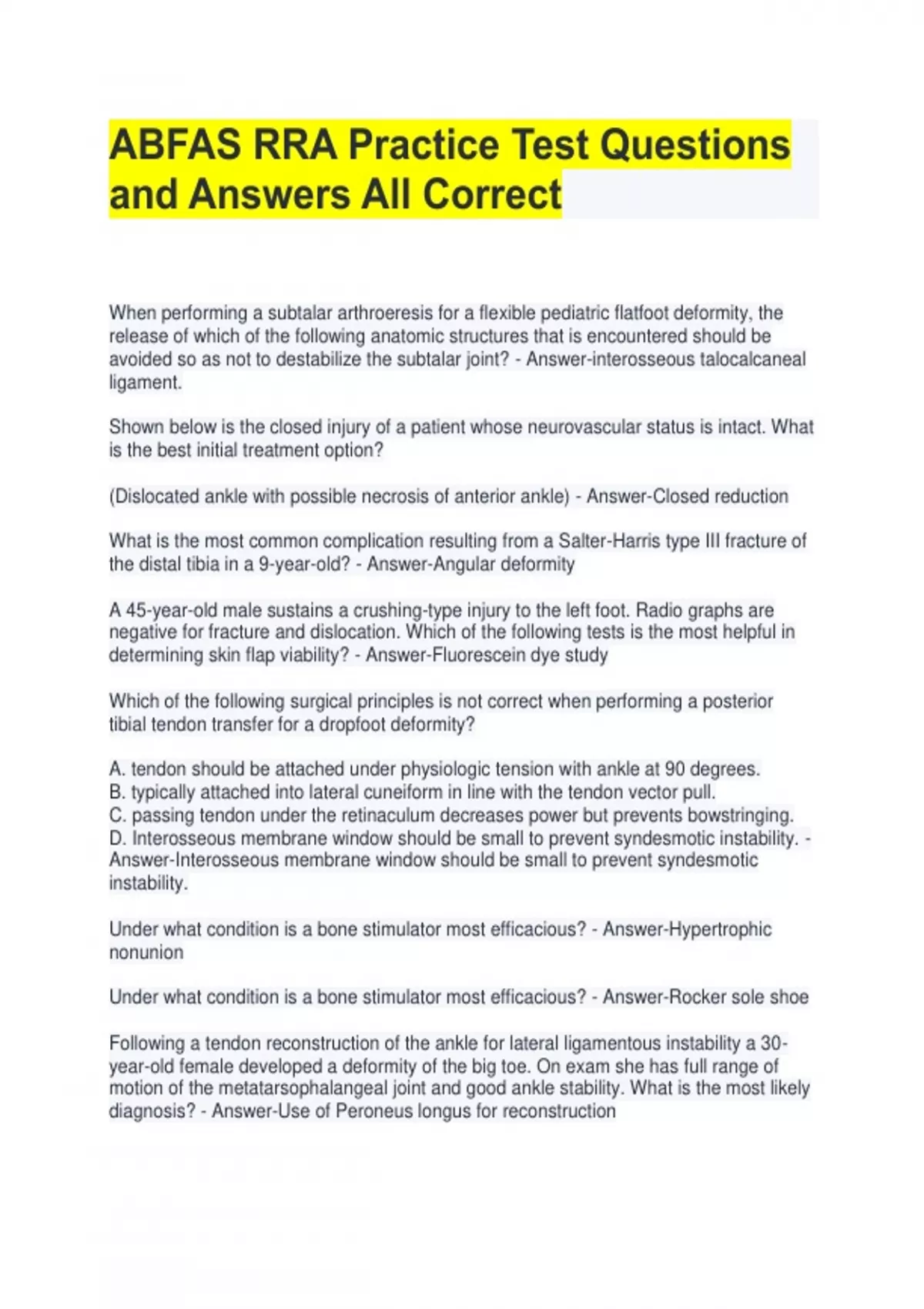 ABFAS RRA Practice Test Questions and Answers All Correct When performing a subtalar arthroeresis for a flexible pediatric flatfoot deformity, the release of which of the following anatomic structures that is encountered should be avoided so as not to destabilize the subtalar joint? - Answer-interosseous talocalcaneal ligament. Shown below is the closed injury of a patient whose neurovascular status is intact. What is the best initial treatment option? (Dislocated ankle with possible necrosis of anterior ankle) - Answer-Closed reduction What is the most common complication resulting from a Salter-Harris type III fracture of the distal tibia in a 9-year-old? - Answer-Angular deformity A 45-year-old male sustains a crushing-type injury to the left foot. Radio graphs are negative for fracture and dislocation. Which of the following tests is the most helpful in determining skin flap viability? - Answer-Fluorescein dye study Which of the following surgical principles is not correct when performing a posterior tibial tendon transfer for a dropfoot deformity? A. tendon should be attached under physiologic tension with ankle at 90 degrees. B. typically attached into lateral cuneiform in line with the tendon vector pull. C. passing tendon under the retinaculum decreases power but prevents bowstringing. D. Interosseous membrane window should be small to prevent syndesmotic instability. - Answer-Interosseous membrane window should be small to prevent syndesmotic instability. Under what condition is a bone stimulator most efficacious? - Answer-Hypertrophic nonunion Under what condition is a bone stimulator most efficacious? - Answer-Rocker sole shoe