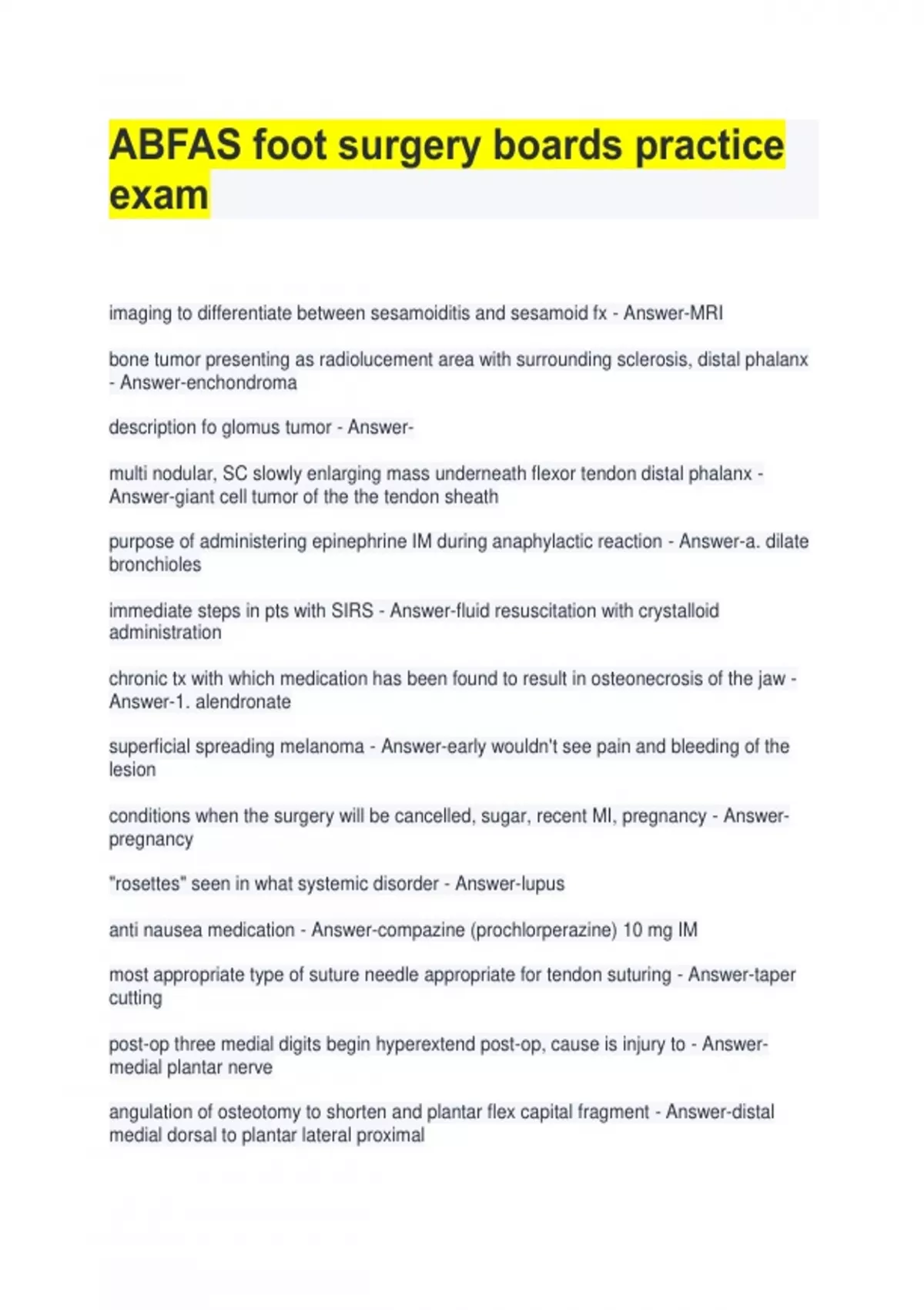 ABFAS foot surgery boards practice exam imaging to differentiate between sesamoiditis and sesamoid fx - Answer-MRI bone tumor presenting as radiolucement area with surrounding sclerosis, distal phalanx - Answer-enchondroma description fo glomus tumor - Answermulti nodular, SC slowly enlarging mass underneath flexor tendon distal phalanx - Answer-giant cell tumor of the the tendon sheath purpose of administering epinephrine IM during anaphylactic reaction - Answer-a. dilate bronchioles immediate steps in pts with SIRS - Answer-fluid resuscitation with crystalloid administration chronic tx with which medication has been found to result in osteonecrosis of the jaw - Answer-1. alendronate