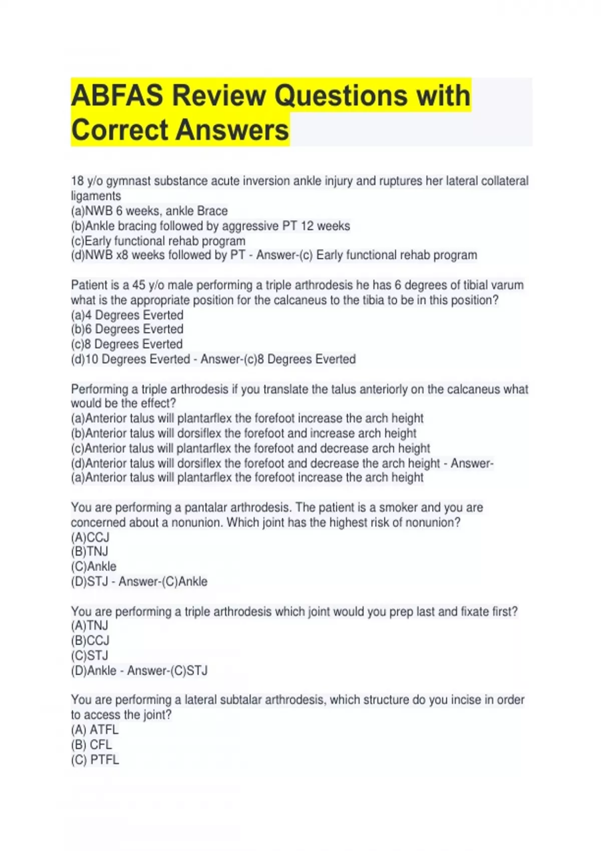 ABFAS Review Questions with Correct Answers 18 y/o gymnast substance acute inversion ankle injury and ruptures her lateral collateral ligaments (a)NWB 6 weeks, ankle Brace (b)Ankle bracing followed by aggressive PT 12 weeks (c)Early functional rehab program (d)NWB x8 weeks followed by PT - Answer-(c) Early functional rehab program Patient is a 45 y/o male performing a triple arthrodesis he has 6 degrees of tibial varum what is the appropriate position for the calcaneus to the tibia to be in this position? (a)4 Degrees Everted (b)6 Degrees Everted (c)8 Degrees Everted (d)10 Degrees Everted - Answer-(c)8 Degrees Everted Performing a triple arthrodesis if you translate the talus anteriorly on the calcaneus what would be the effect? (a)Anterior talus will plantarflex the forefoot increase the arch height (b)Anterior talus will dorsiflex the forefoot and increase arch height (c)Anterior talus will plantarflex the forefoot and decrease arch height (d)Anterior talus will dorsiflex the forefoot and decrease the arch height - Answer- (a)Anterior talus will plantarflex the forefoot increase the arch height You are performing a pantalar arthrodesis. The patient is a smoker and you are concerned about a nonunion. Which joint has the highest risk of nonunion? (A)CCJ (B)TNJ (C)Ankle (D)STJ - Answer-(C)Ankle You are performing a triple arthrodesis which joint would you prep last and fixate first? (A)TNJ (B)CCJ (C)STJ (D)Ankle - Answer-(C)STJ You are performing a lateral subtalar arthrodesis, which structure do you incise in order to access the joint? (A) ATFL (B) CFL (C) PTFL (D) Bifurcate ligament - Answer-(B) CFL You are performing a STJ arthrodesis what is the hardest deformity to fix (A) Varus (B) Valgus (C) Sagittal Plane (D) Transverse plane - Answer-(A) Varus You are performing an ankle arthrodesis on a patient you make a mistake with positioning of the arthrodesis, which position would be best to have the foot in? (A)5 Degrees Plantarflexed (B)5 Degrees Dorsiflexed (C)5 mm Anteriorly Offset (D)6 degrees of valgus - Answer-(B)5 Degrees Dorsiflexed You are with a certain attending who fuses the ankle in a plantarflexed position, what would be the complication with this positioning? (A) Shoulder drop on the affected side (B) Supination of the affected extremity (C) Pronation of the contralateral extremity (D) Vaulting gait - Answer-(D) Vaulting gait What would be a contraindication to Arthroscopic ankle arthrodesis? (A)Severe Inflammatory Arthritis (B)Endstage arthritis with extensive osteophytes (C)BMI 35 (D)15 degrees of ankle varus - Answer-(D)15 degrees of ankle varus Also 5 degrees of varus. 10 degrees varus/valgus for TAR contraindication You are performing a triple arthrodesis. You put the patient in varus by accident. What would be the most common complication ? (A) Ankle Arthritis (B) Lateral Column Pain (C) Lateral ankle instability (D) Plantar Fasciitis - Answer-(B) Lateral Column Pain Patient has a calcaneal fracture with a massive lateral wall blowout. What is the most common complication for a poor reduction? (A)Nonunion (B)Lateral Column Instability (C)Peroneal Tendonitis (D)Sural Neuritis - Answer-(C)Peroneal Tendonitis Patient has a 4 cm rupture of the achilles tendon you repair the rupture what is the most common complication? (A)Re-rupture (B)Infection (C)Weakness (D)Dehiscence - Answer-(D)Dehiscence