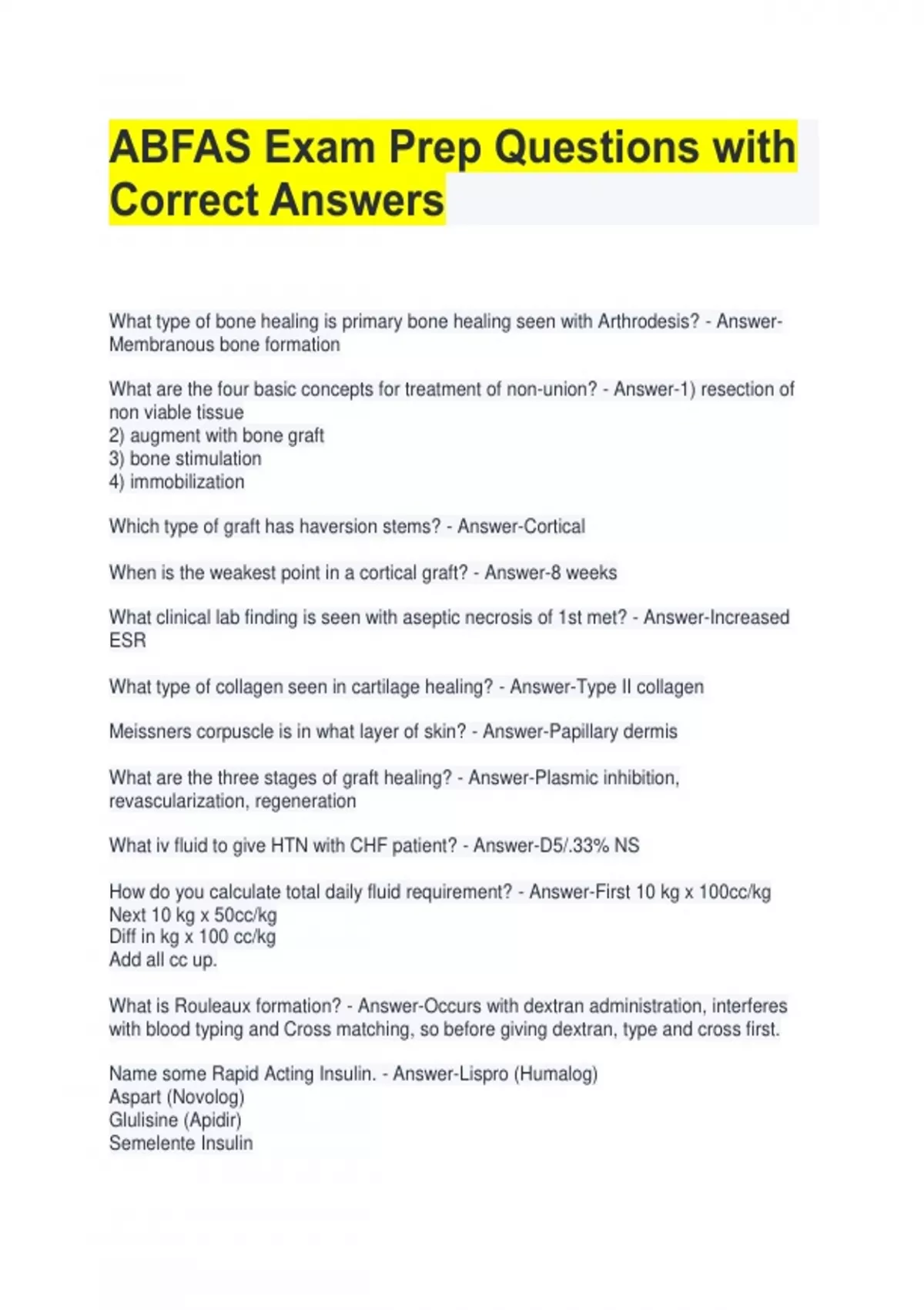 ABFAS Exam Prep Questions with Correct Answers What type of bone healing is primary bone healing seen with Arthrodesis? - AnswerMembranous bone formation What are the four basic concepts for treatment of non-union? - Answer-1) resection of non viable tissue 2) augment with bone graft 3) bone stimulation 4) immobilization Which type of graft has haversion stems? - Answer-Cortical When is the weakest point in a cortical graft? - Answer-8 weeks What clinical lab finding is seen with aseptic necrosis of 1st met? - Answer-Increased ESR What type of collagen seen in cartilage healing? - Answer-Type II collagen Meissners corpuscle is in what layer of skin? - Answer-Papillary dermis What are the three stages of graft healing? - Answer-Plasmic inhibition, revascularization, regeneration What iv fluid to give HTN with CHF patient? - Answer-D5/.33% NS How do you calculate total daily fluid requirement? - Answer-First 10 kg x 100cc/kg Next 10 kg x 50cc/kg Diff in kg x 100 cc/kg Add all cc up. What is Rouleaux formation? - Answer-Occurs with dextran administration, interferes with blood typing and Cross matching, so before giving dextran, type and cross first. Name some Rapid Acting Insulin. - Answer-Lispro (Humalog) Aspart (Novolog) Glulisine (Apidir) Semelente Insulin Which is not a isotonic fluid? - normal saline - ringers lactate - 5% albumin - 3% NaCl - Answer-3% NaCl