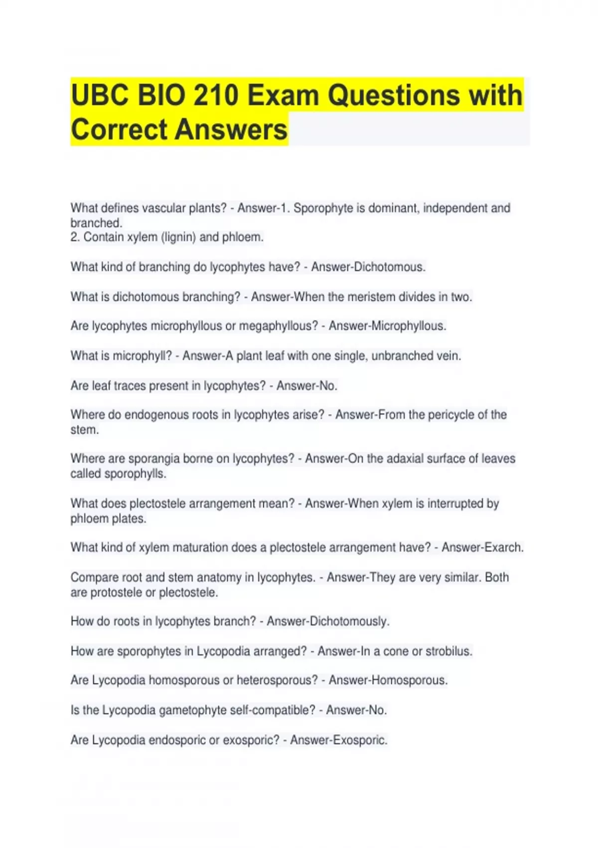 UBC BIO 210 Exam Questions with Correct Answers What defines vascular plants? - Answer-1. Sporophyte is dominant, independent and branched. 2. Contain xylem (lignin) and phloem. What kind of branching do lycophytes have? - Answer-Dichotomous. What is dichotomous branching? - Answer-When the meristem divides in two. Are lycophytes microphyllous or megaphyllous? - Answer-Microphyllous. What is microphyll? - Answer-A plant leaf with one single, unbranched vein. Are leaf traces present in lycophytes? - Answer-No. Where do endogenous roots in lycophytes arise? - Answer-From the pericycle of the stem. Where are sporangia borne on lycophytes? - Answer-On the adaxial surface of leaves called sporophylls. What does plectostele arrangement mean? - Answer-When xylem is interrupted by phloem plates. What kind of xylem maturation does a plectostele arrangement have? - Answer-Exarch. Compare root and stem anatomy in lycophytes. - Answer-They are very similar. Both are protostele or plectostele. How do roots in lycophytes branch? - Answer-Dichotomously. How are sporophytes in Lycopodia arranged? - Answer-In a cone or strobilus. Are Lycopodia homosporous or heterosporous? - Answer-Homosporous. Is the Lycopodia gametophyte self-compatible? - Answer-No. Are Lycopodia endosporic or exosporic? - Answer-Exosporic.