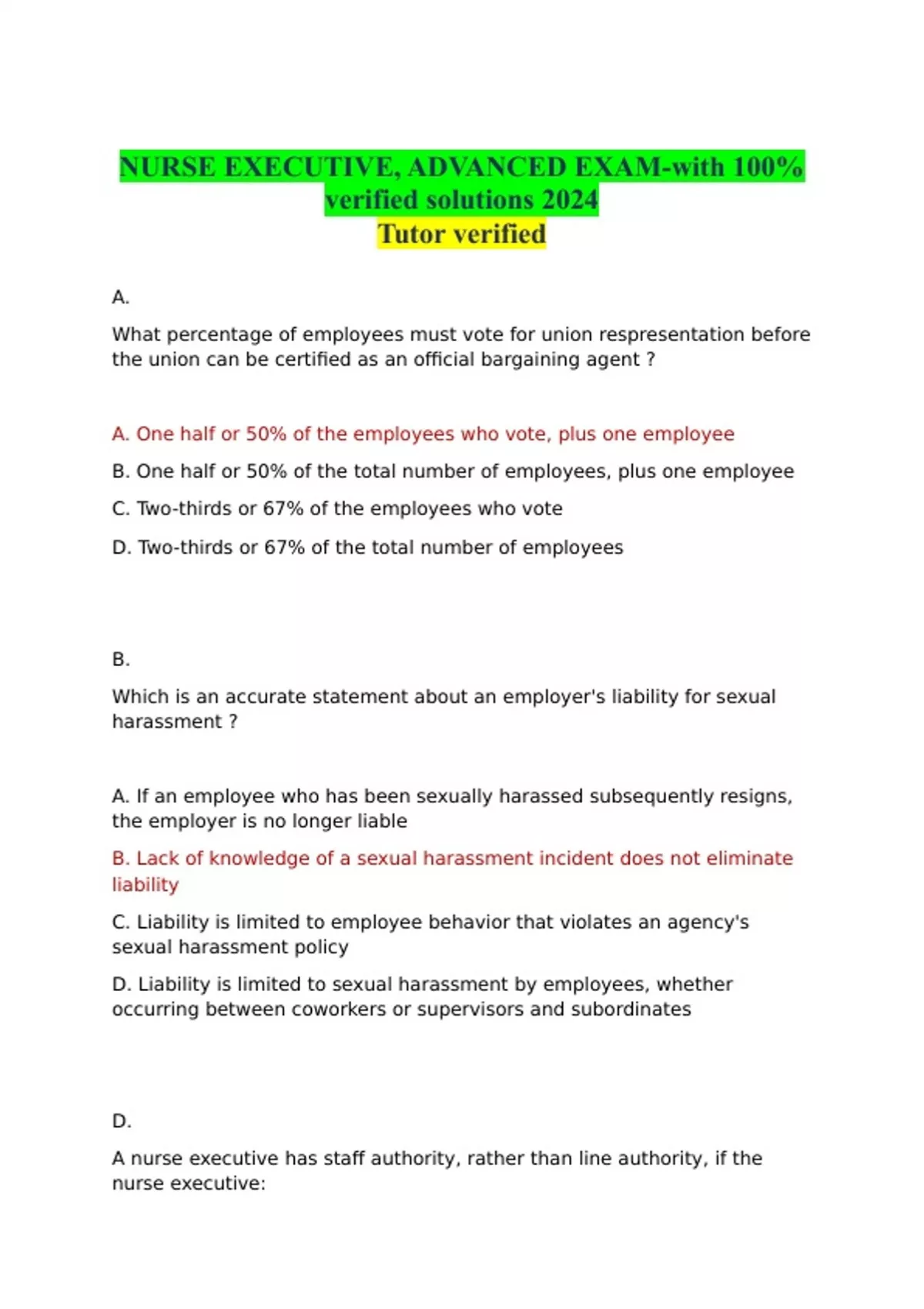 NURSE EXECUTIVE, ADVANCED EXAM-with 100% verified solutions 2024