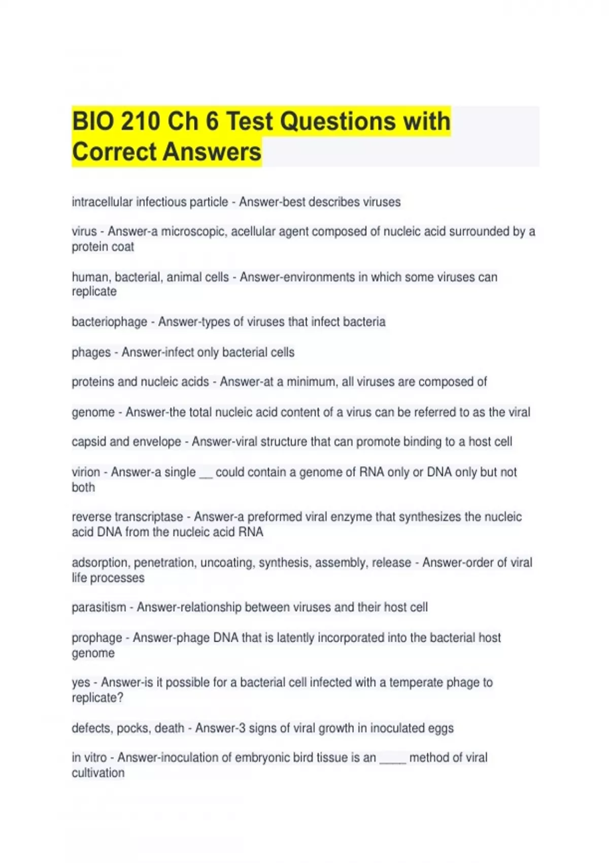 BIO 210 Ch 6 Test Questions with Correct Answers intracellular infectious particle - Answer-best describes viruses virus - Answer-a microscopic, acellular agent composed of nucleic acid surrounded by a protein coat human, bacterial, animal cells - Answer-environments in which some viruses can replicate bacteriophage - Answer-types of viruses that infect bacteria phages - Answer-infect only bacterial cells proteins and nucleic acids - Answer-at a minimum, all viruses are composed of genome - Answer-the total nucleic acid content of a virus can be referred to as the viral capsid and envelope - Answer-viral structure that can promote binding to a host cell virion - Answer-a single __ could contain a genome of RNA only or DNA only but not both reverse transcriptase - Answer-a preformed viral enzyme that synthesizes the nucleic acid DNA from the nucleic acid RNA
