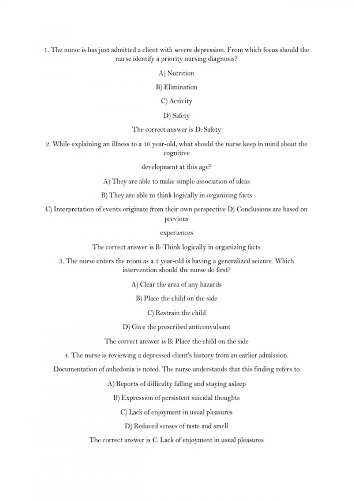 The nurse is has just admitted a client with severe depression. From which focus should the nurse identify a priority nursing diagnosis? A) Nutrition B) Elimination C) Activity D) Safety The correct answer is D: Safety 2. While explaining an illness to a 10 year-old, what should the nurse keep in mind about the cognitive development at this age? A) They are able to make simple association of ideas B) They are able to think logically in organizing facts C) Interpretation of events originate from their own perspective D) Conclusions are based o