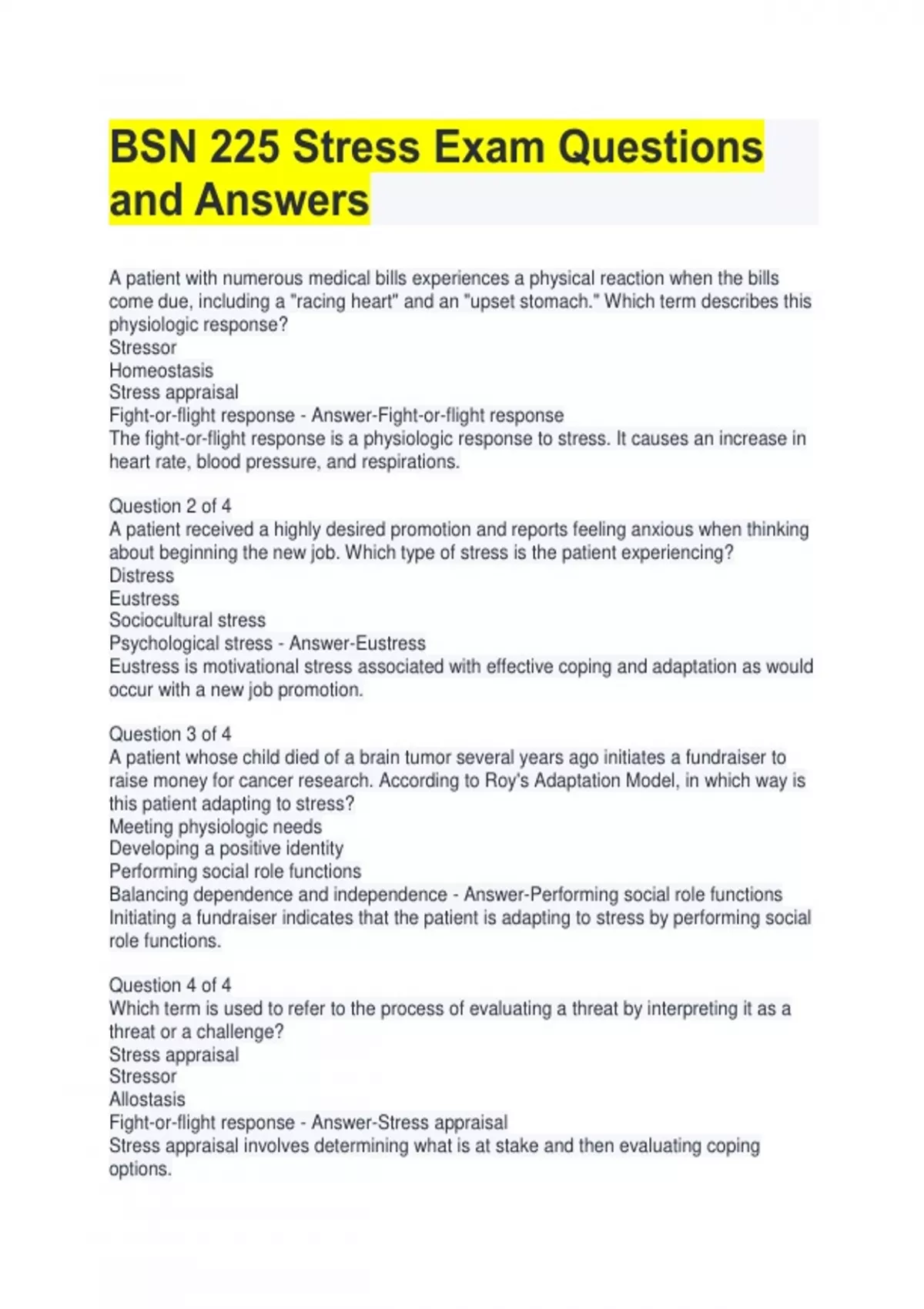 BSN 225 Stress Exam Questions and Answers A patient with numerous medical bills experiences a physical reaction when the bills come due, including a "racing heart" and an "upset stomach." Which term describes this physiologic response? Stressor Homeostasis Stress appraisal Fight-or-flight response - Answer-Fight-or-flight response The fight-or-flight response is a physiologic response to stress. It causes an increase in heart rate, blood pressure, and respirations. Question 2 of 4 A patient received a highly desired promotion and reports feeling anxious when thinking about beginning the new job. Which type of stress is the patient experiencing? Distress Eustress Sociocultural stress Psychological stress - Answer-Eustress Eustress is motivational stress associated with effective coping and adaptation as would occur with a new job promotion. Question 3 of 4 A patient whose child died of a brain tumor several years ago initiates a fundraiser to raise money for cancer research. According to Roy's Adaptation Model, in which way is this patient adapting to stress? Meeting physiologic needs Developing a positive identity Performing social role functions Balancing dependence and independence - Answer-Performing social role functions Initiating a fundraiser indicates that the patient is adapting to stress by performing social role functions. Question 4 of 4 Which term is used to refer to the process of evaluating a threat by interpreting it as a threat or a challenge? Stress appraisal Stressor Allostasis Fight-or-flight response - Answer-Stress appraisal Stress appraisal involves determining what is at stake and then evaluating coping options. Question 1 of 3 Which physiologic response to stress is an example of why a patient might experience gastrointestinal distress during stressful situations? Increase in food digestion Increase in blood flow to the muscles Increase in kidney function Increase in digestive tract activity - Answer-Increase in blood flow to the muscles During a stressful situation, there is an increase in the flow of blood to the muscles at the expense of the digestive system and other systems not immediately needed in the fight-or-flight response. Question 2 of 3 Which phrases describe how stress increases a patient's susceptibility to disease? Select all that apply. Increases sleep Impairs lymphocyte activity Increases reactivation of viruses Decreases response to antibiotics Accelerates progression of HIV to AIDS - Answer-Impairs lymphocyte activity Stress decreases the activity of some lymphocytes, decreasing the body's ability to fight infection. Increases reactivation of viruses Periodic reactivation of herpes infections, especially herpes simplex virus type 1 and type 2 (HSV-1and HSV-2) infections, commonly occurs with stress. Accelerates progression of HIV to AIDS Stress accelerates the progression of HIV infection toward active AIDS. Question 3 of 3 The nurse is caring for a patient who reports a lack of energy and insomnia caused by stress. Which other assessment finding would the nurse anticipate? Panic Depression Anxiety - Answer-Depression People experiencing depression may feel worthless, guilty, or hopeless, and may experience physiologic symptoms such as lack of energy. Question 1 of 3 Which coping mechanisms are healthy for a 12-year-old who is stressed about school grades? Select all that apply. Creating a daily study schedule Talking with a teacher about how to improve grades Making an appointment with the guidance counselor Giving up video games for an hour a day to study Telling parents, "There's nothing I can do to improve." - Answer-Creating a daily study schedule Talking with a teacher about how to improve grades Making an appointment with the guidance counselor Giving up video games for an hour a day to study Question 2 of 3 Which reactions to stress are considered unhealthy coping mechanisms? Select all that apply. Refusing to discuss the stress Exercising to relieve the stress Keeping a journal about the stress Chronically using pain medication Refusing to acknowledge the stress - Answer-Refusing to discuss the stress Chronically using pain medication Refusing to acknowledge the stress Question 3 of 3 Which patient statement regarding coping indicates that teaching by the nurse has been effective? "The way I cope may change over time." "All coping styles are healthy responses to stress." "Coping ensures that I will resolve my problems." "Everyone copes in the same basic way." - Answer-"The way I cope may change over time." Coping is a dynamic process and may change with the stressor or over time. Question 1 of 3 When dealing with stressors, to which group will a 17-year-old patient most readily relate? Younger siblings who live in the same home with the patient Peers that go to school with the patient Mother and father of the patient Teachers and counselors that the patient trusts - Answer-Peers that go to school with the patient Teenagers relate to their own peer group most closely and readily.