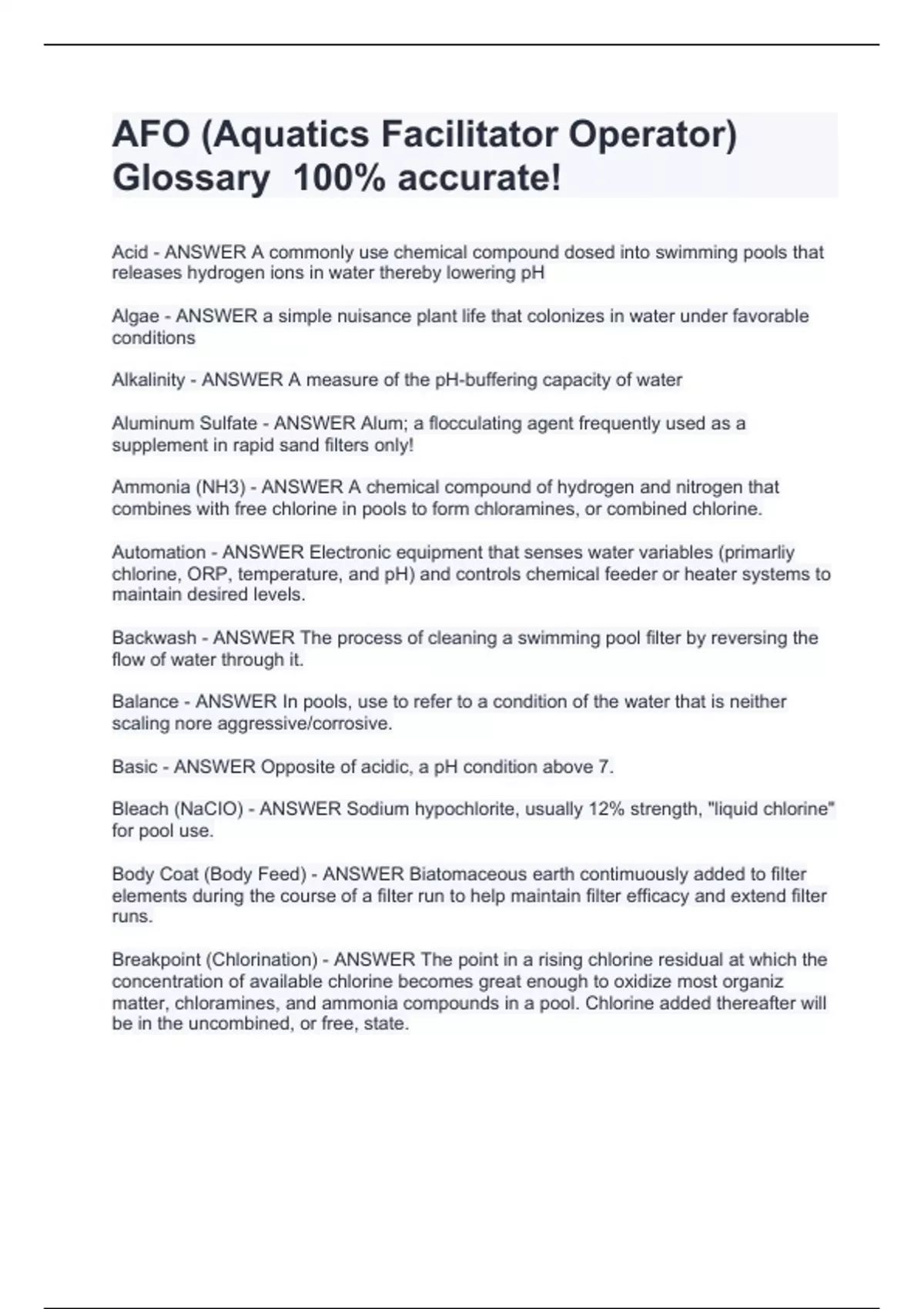 AFO (Aquatics Facilitator Operator) Glossary 100% accurate! Acid - ANSWER A commonly use chemical compound dosed into swimming pools that releases hydrogen ions in water thereby lowering pH Algae - ANSWER a simple nuisance plant life that colonizes in water under favorable conditions Alkalinity - ANSWER A measure of the pH-buffering capacity of water Aluminum Sulfate - ANSWER Alum; a flocculating agent frequently used as a supplement in rapid sand filters only! Ammonia (NH3) - ANSWER A chemical compound of hydrogen and nitrogen that combines with free chlorine in pools to form chloramines, or combined chlorine. Automation - ANSWER Electronic equipment that senses water variables (primarliy chlorine, ORP, temperature, and pH) and controls chemical feeder or heater systems to maintain desired levels. Backwash - ANSWER The process of cleaning a swimming pool filter by reversing the flow of water through it. Balance - ANSWER In pools, use to refer to a condition of the water that is neither scaling nore aggressive/corrosive. Basic - ANSWER Opposite of acidic, a pH condition above 7. Bleach (NaCIO) - ANSWER Sodium hypochlorite, usually 12% strength, "liquid chlorine" for pool use. Body Coat (Body Feed) - ANSWER Biatomaceous earth contimuously added to filter elements during the course of a filter run to help maintain filter efficacy and extend filter runs. Breakpoint (Chlorination) - ANSWER The point in a rising chlorine residual at which the concentration of available chlorine becomes great enough to oxidize most organiz matter, chloramines, and ammonia compounds in a pool. Chlorine added thereafter will be in the uncombined, or free, state.