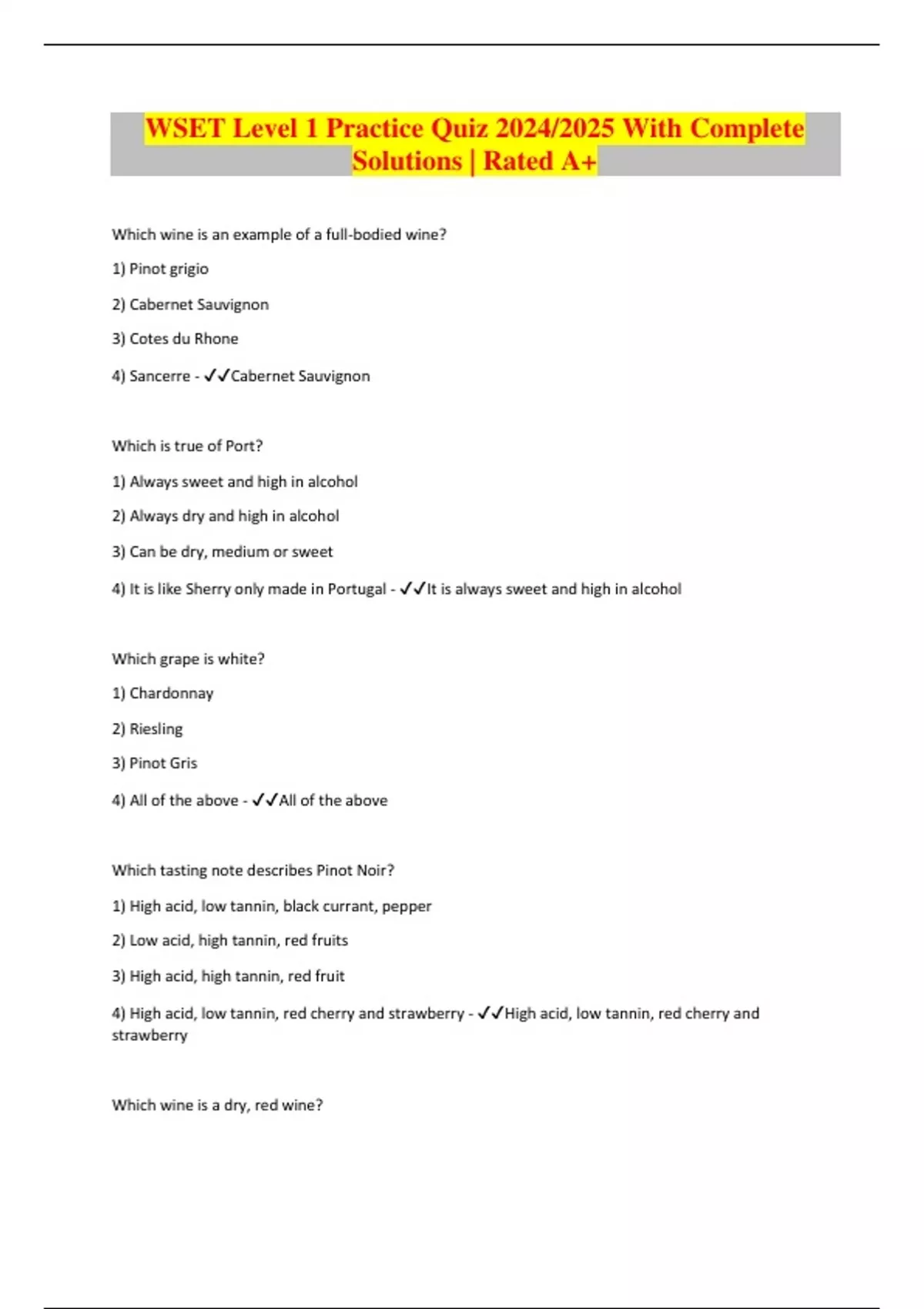 WSET Level 1 Practice Quiz 2024/2025 With Complete Solutions | Rated A+ Which wine is an example of a full-bodied wine? 1) Pinot grigio 2) Cabernet Sauvignon 3) Cotes du Rhone 4) Sancerre - Cabernet Sauvignon Which is true of Port? 1) Always sweet and high in alcohol 2) Always dry and high in alcohol 3) Can be dry, medium or sweet 4) It is like Sherry only made in Portugal - It is always sweet and high in alcohol Which grape is white? 1) Chardonnay 2) Riesling 3) Pinot Gris 4) All of the above - All of the above Which tasting note describes Pinot Noir? 1) High acid, low tannin, black currant, pepper 2) Low acid, high tannin, red fruits 3) High acid, high tannin, red fruit 4) High acid, low tannin, red cherry and strawberry - High acid, low tannin, red cherry and strawberry Which wine is a dry, red wine?