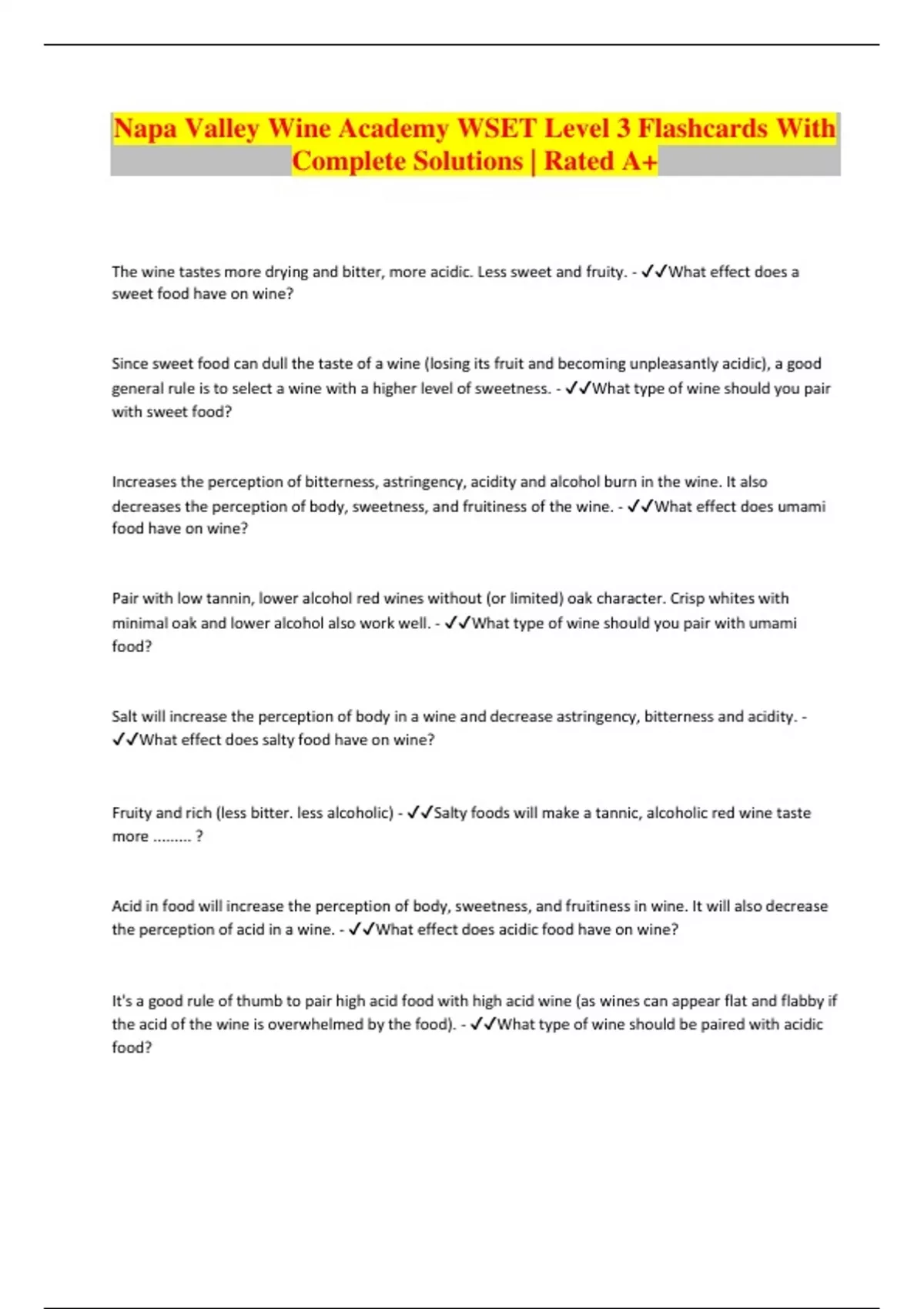 Napa Valley Wine Academy WSET Level 3 Flashcards With Complete Solutions | Rated A+ The wine tastes more drying and bitter, more acidic. Less sweet and fruity. - What effect does a sweet food have on wine? Since sweet food can dull the taste of a wine (losing its fruit and becoming unpleasantly acidic), a good general rule is to select a wine with a higher level of sweetness. - What type of wine should you pair with sweet food? Increases the perception of bitterness, astringency, acidity and alcohol burn in the wine. It also decreases the perception of body, sweetness, and fruitiness of the wine. - What effect does umami food have on wine? Pair with low tannin, lower alcohol red wines without (or limited) oak character. Crisp whites with minimal oak and lower alcohol also work well. - What type of wine should you pair with umami food? Salt will increase the perception of body in a wine and decrease astringency, bitterness and acidity. - What effect does salty food have on wine? Fruity and rich (less bitter. less alcoholic) - Salty foods will make a tannic, alcoholic red wine taste more ......... ? Acid in food will increase the perception of body, sweetness, and fruitiness in wine. It will also decrease the perception of acid in a wine. - What effect does acidic food have on wine? It's a good rule of thumb to pair high acid food with high acid wine (as wines can appear flat and flabby if the acid of the wine is overwhelmed by the food). - What type of wine should be paired with acidic food?