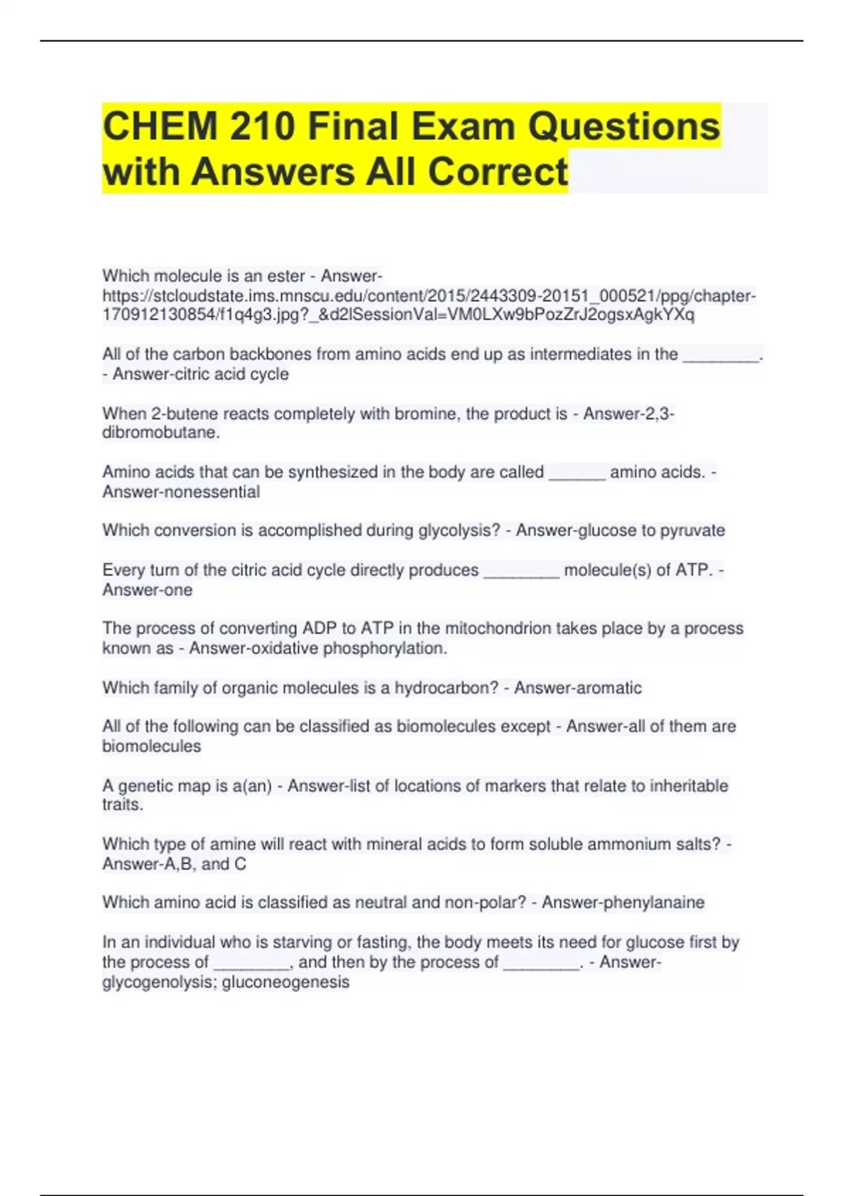 CHEM 210 Final Exam Questions with Answers All Correct Which molecule is an ester - Answer All of the carbon backbones from amino acids end up as intermediates in the ________. - Answer-citric acid cycle When 2-butene reacts completely with bromine, the product is - Answer-2,3- dibromobutane. Amino acids that can be synthesized in the body are called ______ amino acids. - Answer-nonessential Which conversion is accomplished during glycolysis? - Answer-glucose to pyruvate Every turn of the citric acid cycle directly produces ________ molecule(s) of ATP. - Answer-one The process of converting ADP to ATP in the mitochondrion takes place by a process known as - Answer-oxidative phosphorylation. Which family of organic molecules is a hydrocarbon? - Answer-aromatic All of the following can be classified as biomolecules except - Answer-all of them are biomolecules A genetic map is a(an) - Answer-list of locations of markers that relate to inheritable traits. Which type of amine will react with mineral acids to form soluble ammonium salts? - Answer-A,B, and C Which amino acid is classified as neutral and non-polar? - Answer-phenylanaine In an individual who is starving or fasting, the body meets its need for glucose first by the process of ________, and then by the process of ________. - Answerglycogenolysis; gluconeogenesis The pathway followed by glucose when energy is needed is - Answer-glycolysis. The alcohol functional group has - Answer-a carbon-oxygen-hydrogen group. The commonly accepted mechanism for explaining alkene reactions involves formation of - Answer-carbocations Lemon juice can be used to remove the odor of fish on a person's hands after cleaning fish. The chemical explanation for this is that the - Answer-acid in the lemon juice reacts with the odor-causing amines to form an odorless salt.