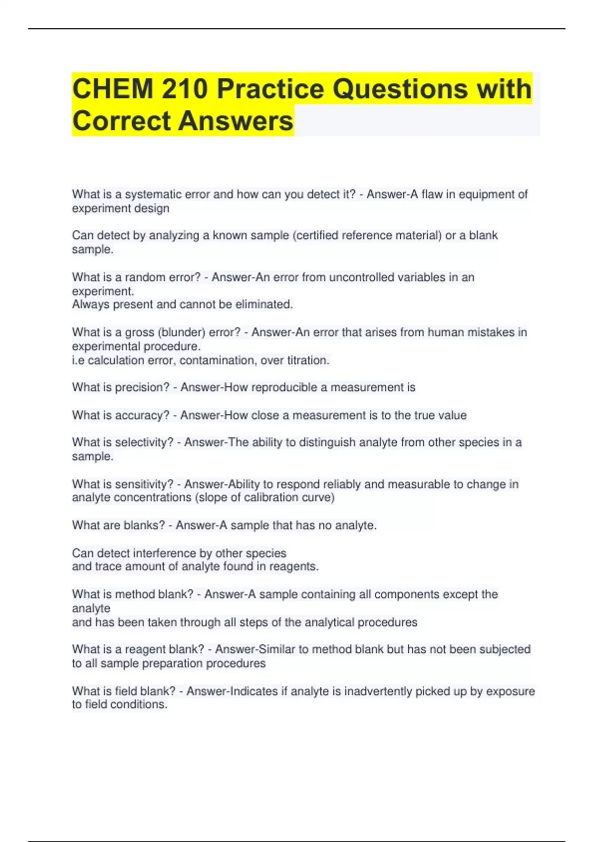 CHEM 210 Practice Questions with Correct Answers What is a systematic error and how can you detect it? - Answer-A flaw in equipment of experiment design Can detect by analyzing a known sample (certified reference material) or a blank sample. What is a random error? - Answer-An error from uncontrolled variables in an experiment. Always present and cannot be eliminated. What is a gross (blunder) error? - Answer-An error that arises from human mistakes in experimental procedure. i.e calculation error, contamination, over titration. What is precision? - Answer-How reproducible a measurement is