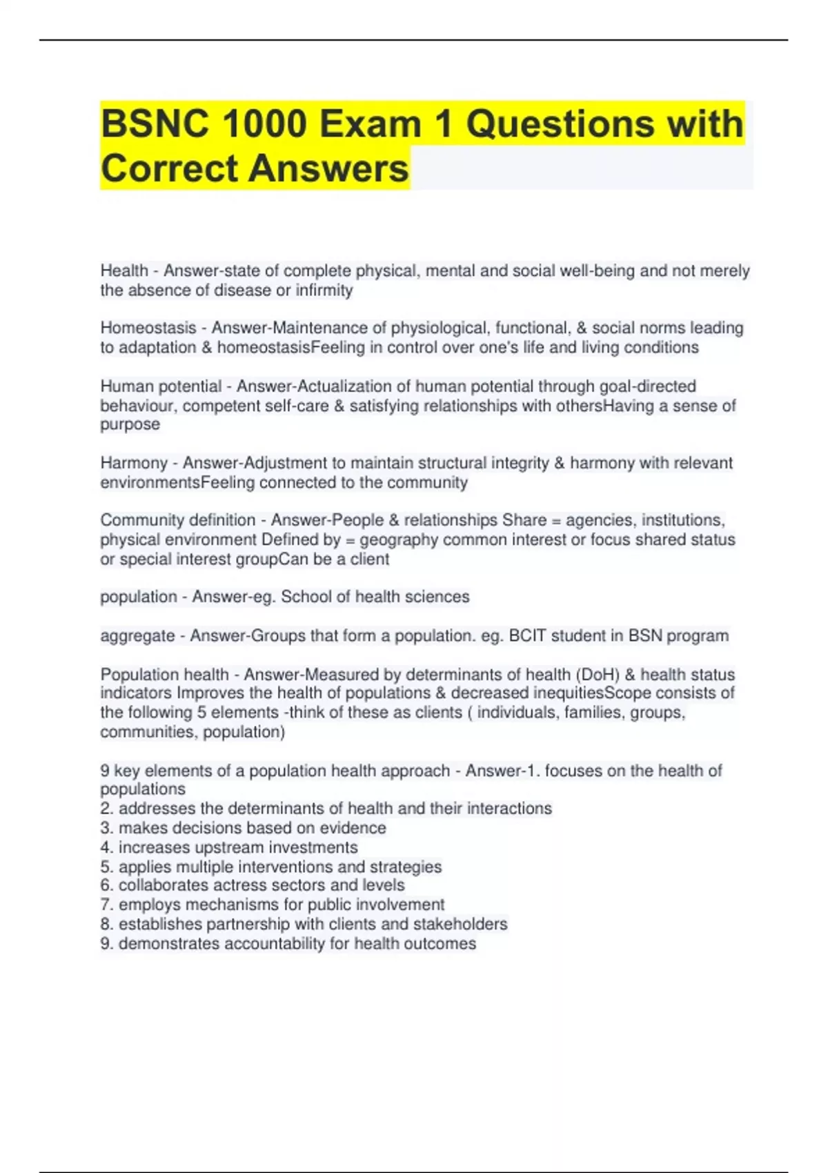BSNC 1000 Exam 1 Questions with Correct Answers Health - Answer-state of complete physical, mental and social well-being and not merely the absence of disease or infirmity Homeostasis - Answer-Maintenance of physiological, functional, & social norms leading to adaptation & homeostasisFeeling in control over one's life and living conditions Human potential - Answer-Actualization of human potential through goal-directed behaviour, competent self-care & satisfying relationships with othersHaving a sense of purpose Harmony - Answer-Adjustment to maintain structural integrity & harmony with relevant environmentsFeeling connected to the community Community definition - Answer-People & relationships Share = agencies, institutions, physical environment Defined by = geography common interest or focus shared status or special interest groupCan be a client population - Answer-eg. School of health sciences aggregate - Answer-Groups that form a population. eg. BCIT student in BSN program Population health - Answer-Measured by determinants of health (DoH) & health status indicators Improves the health of populations & decreased inequitiesScope consists of the following 5 elements -think of these as clients ( individuals, families, groups, communities, population) 9 key elements of a population health approach - Answer-1. focuses on the health of populations 2. addresses the determinants of health and their interactions 3. makes decisions based on evidence 4. increases upstream investments 5. applies multiple interventions and strategies 6. collaborates actress sectors and levels 7. employs mechanisms for public involvement 8. establishes partnership with clients and stakeholders 9. demonstrates accountability for health outcomes Population health: Four sub-concepts - Answer-Health promotion, Illness and injury prevention, Chronic disease management, Epidemiology