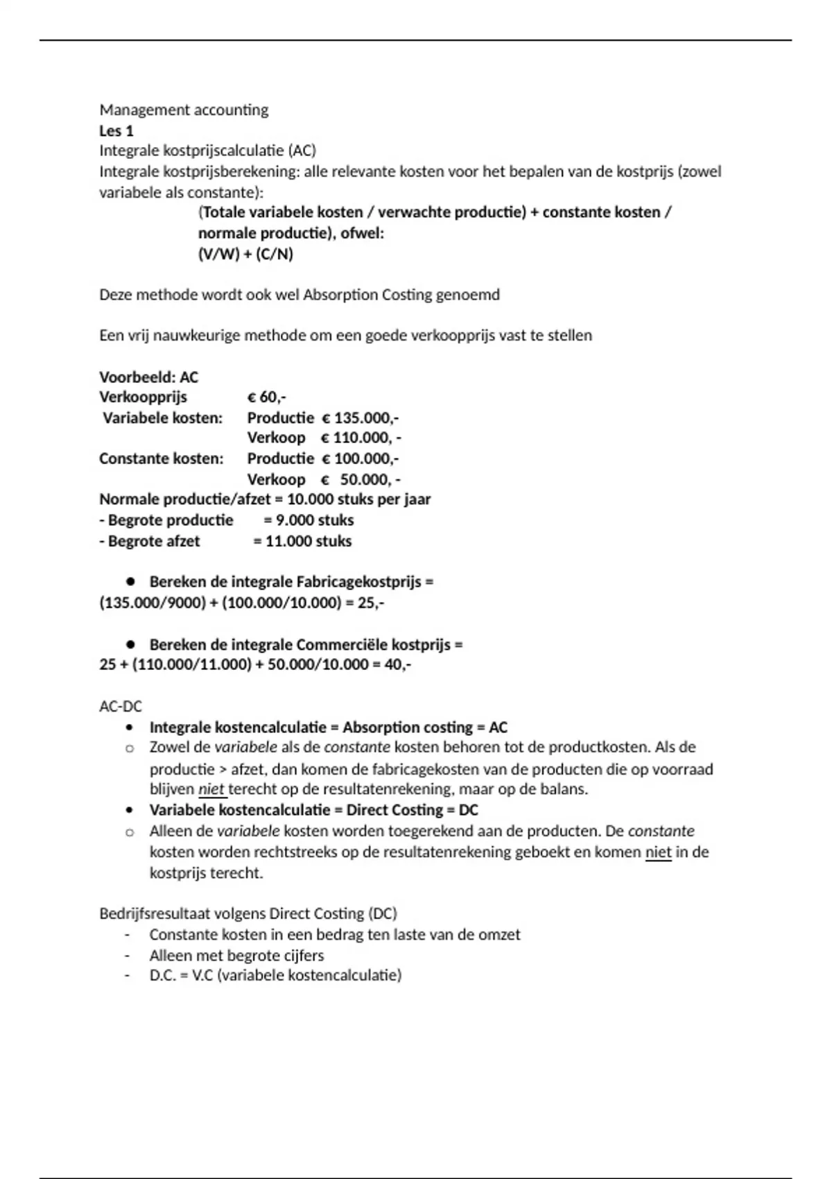 • Integrale kostencalculatie = Absorption costing = AC