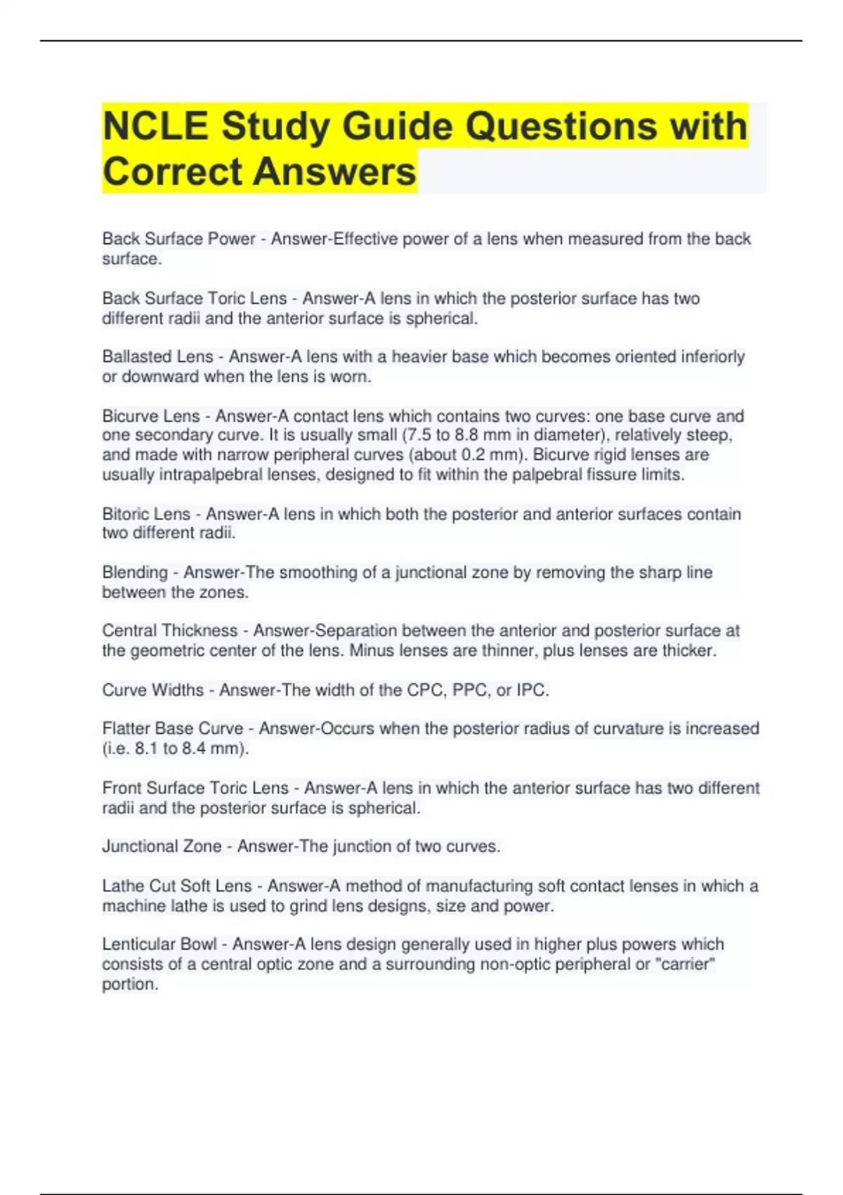 NCLE Study Guide Questions with Correct Answers Back Surface Power - Answer-Effective power of a lens when measured from the back surface. Back Surface Toric Lens - Answer-A lens in which the posterior surface has two different radii and the anterior surface is spherical. Ballasted Lens - Answer-A lens with a heavier base which becomes oriented inferiorly or downward when the lens is worn. Bicurve Lens - Answer-A contact lens which contains two curves: one base curve and one secondary curve. It is usually small (7.5 to 8.8 mm in diameter), relatively steep, and made with narrow peripheral curves (about 0.2 mm). Bicurve rigid lenses are usually intrapalpebral lenses, designed to fit within the palpebral fissure limits. Bitoric Lens - Answer-A lens in which both the posterior and anterior surfaces contain two different radii. Blending - Answer-The smoothing of a junctional zone by removing the sharp line between the zones. Central Thickness - Answer-Separation between the anterior and posterior surface at the geometric center of the lens. Minus lenses are thinner, plus lenses are thicker. Curve Widths - Answer-The width of the CPC, PPC, or IPC. Flatter Base Curve - Answer-Occurs when the posterior radius of curvature is increased (i.e. 8.1 to 8.4 mm). Front Surface Toric Lens - Answer-A lens in which the anterior surface has two different radii and the posterior surface is spherical. Junctional Zone - Answer-The junction of two curves. Lathe Cut Soft Lens - Answer-A method of manufacturing soft contact lenses in which a machine lathe is used to grind lens designs, size and power. Lenticular Bowl - Answer-A lens design generally used in higher plus powers which consists of a central optic zone and a surrounding non-optic peripheral or "carrier" portion. Against-the-rule Astigmatism - Answer-The horizontal meridian (180°) of the cornea is steeper. Binocular Vision - Answer-The ability to use two eyes together, which is integral to stereoscopic vision. Biomicroscope (Slit Lamp) - Answer-An instrument with high-intensity light source and a biomicroscope, used to examine the anterior and posterior segments of the eye. The binocular slit-lamp gives a stereoscopic and magnified view.