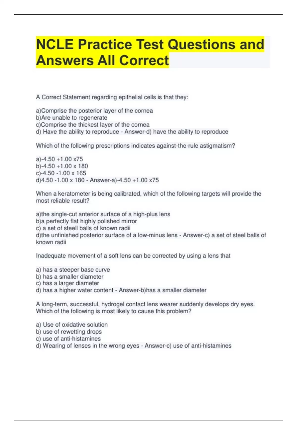NCLE Practice Test Questions and Answers All Correct A Correct Statement regarding epithelial cells is that they: a)Comprise the posterior layer of the cornea b)Are unable to regenerate c)Comprise the thickest layer of the cornea d) Have the ability to reproduce - Answer-d) have the ability to reproduce Which of the following prescriptions indicates against-the-rule astigmatism? a)-4.50 +1.00 x75 b)-4.50 +1.00 x 180 c)-4.50 -1.00 x 165 d)4.50 -1.00 x 180 - Answer-a)-4.50 +1.00 x75 When a keratometer is being calibrated, which of the following targets will provide the most reliable result? a)the single-cut anterior surface of a high-plus lens b)a perfectly flat highly polished mirror c) a set of steell balls of known radii d)the unfinished posterior surface of a low-minus lens - Answer-c) a set of steel balls of known radii Inadequate movement of a soft lens can be corrected by using a lens that a) has a steeper base curve b) has a smaller diameter c) has a larger diameter d) has a higher water content - Answer-b)has a smaller diameter A long-term, successful, hydrogel contact lens wearer suddenly develops dry eyes. Which of the following is most likely to cause this problem? a) Use of oxidative solution b) use of rewetting drops c) use of anti-histamines d) Wearing of lenses in the wrong eyes - Answer-c) use of anti-histamines During slit-lamp evaluation, on upward gaze, a patient's soft contact lenses move 0.5 to 1mm when the patient blinks. These lenses are: a) a good fit b) too loose c) too tight d) too large - Answer-a) a good fit A new daily wearer of soft lenses returns for the first follow up visit with itching, burning, injected eyes. The most likely cause of these problems is: a) solution reaction b) giant-cell papillary conjunctivitis c) a lens fit that is too loose d) inability to wear soft lenses - Answer-a) solution reaction Which of the following is the mode of slit-lamp illumination used to view the early stages of microcystic edema? a) Retroillumination b) Direct illumination c) Parrallelpiped d) Oscillation - Answer-a) Retroillumination Which of the following changes is best able to improve oxygen transmissibility to a patient's cornea? a) Increasing tear exchange b) Increasing Dk c) Increasing optical zone diameter d) Increasing CN bevel - Answer-b) Increasing Dk In using fluorescein to evaluate the fit of a rigid lens of 9.0mm diameter on a typical eye, a correct statement is that: a) apical touch with pooling in the PPC curve area is preferred b) apical toxicity may not be obvious c) apical pooling with edge touch is recommended d) apical area, mid-peripheral area, and the lens edges should be assessed - Answer-d) apical area, mid-peripheral area, and the lens edges should be assessed Which of the following changes would improve a rigid contact lens fit that shows sluggish movement after 1 hour of wear? a) Add hyperflange edge treatment b) Reduce overall diameter c) Decrease center thickness d) Increase overall diameter - Answer-b) Reduce overall diameter Moving a +7.50 RX from the spectacle plane to the corneal plane will require: a) no change in power b) more minus power c) more plus power d) less plus power - Answer-c) more plus power